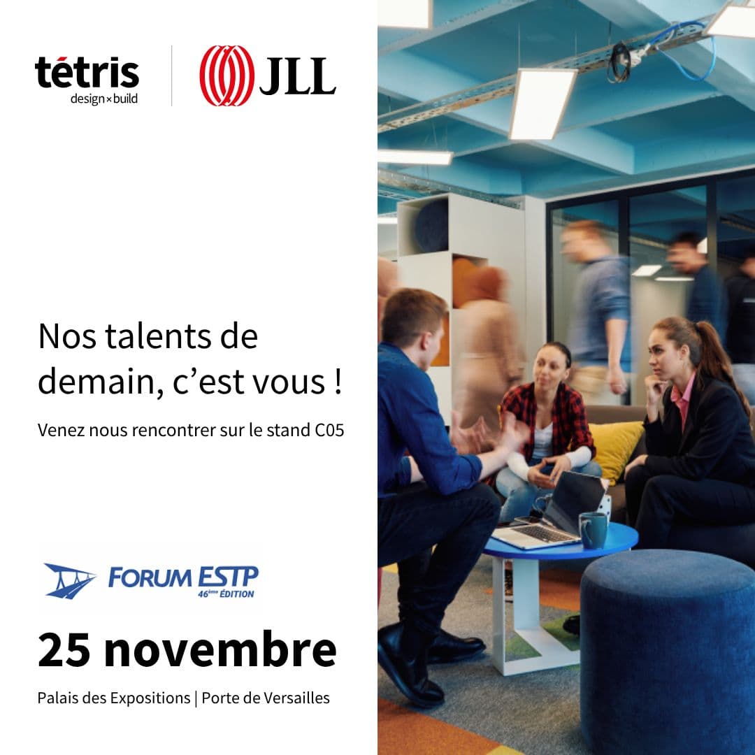 JLL Tétris participera à la 45ème édition du Forum ESTP le 26 Novembre prochain au Parc des expositions Porte de Versailles! Organisé par des étudiants de l'Ecole Spéciale des Travaux Publics, le Forum ESTP, est l'un des plus grands forums entreprises en France depuis 45 ans. Chaque année, 26 étudiants travaillent ensemble pour accueillir plus de 200 entreprises et 6 500 visiteurs, offrant aux jeunes ingénieurs des opportunités de stages, d'emplois, et de networking avec des professionnels des secteurs de la construction, de l'ingénierie, et de l'immobilier. Ce rendez-vous intergénérationnel favorise les échanges entre les recruteurs et les étudiants, tout en mettant en avant des thèmes d'actualité comme la transition écologique, la construction durable, et les technologies émergentes. Il s'impose comme un moment phare pour les futurs ingénieurs souhaitant lancer leurs carrières et les entreprises à la recherche de nouveaux talents. Venez rencontrer nos équipes opérationnelles et RH afin de parler de nos métiers, nos projets et nos parcours de carrière au sein du groupe.