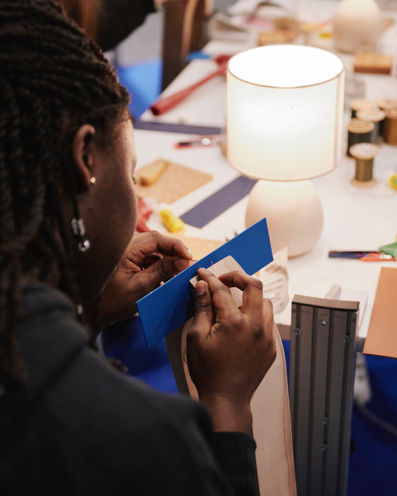 Lors des finales régionales de la 48e Compétition des métiers Grand Est, les artisans Hermès ont partagé la passion de leur métier et initié les visiteurs au geste précis de la couture au point sellier, emblématique des savoir-faire maroquiniers de la maison.