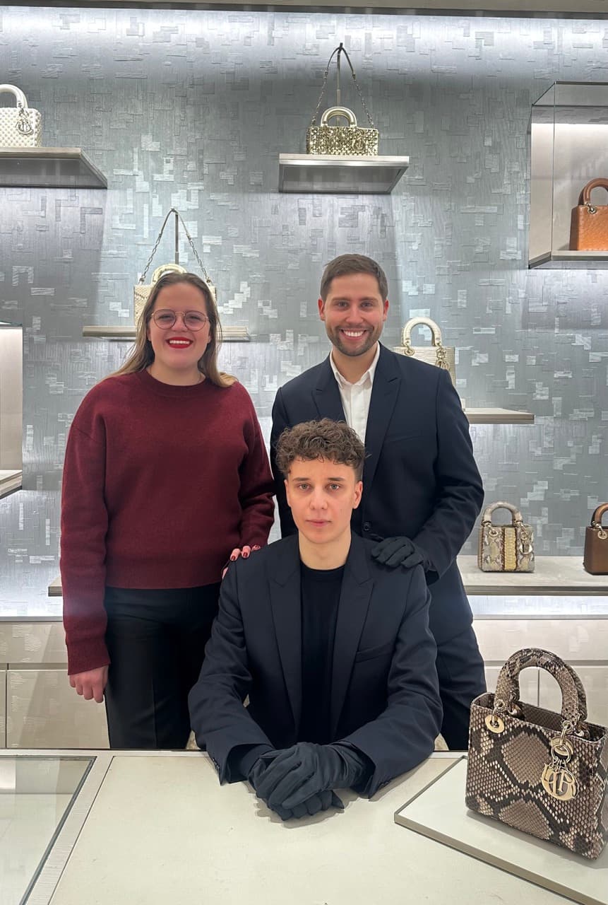 Trust and respect are the foundation of my support system at Dior. I was lucky to be paired with Justine Sanchez, my maitre d'apprentissage, who has guided me since my very first day. Elisabeth Chen has been an incredible mentor, teaching me the art of perfect Dior wrapping with her signature positivity. I am also grateful to managers like Nolwenn, Bleunne, and Francesco, who are coaching me on a daily basis, without missing any axis. Even Marius, who joined as a Junior at the same time as myself, together with Apolline has been a great support. My supervisors Maeva, Soraya, Weija, ensure I deliver excellent service, while Jeremy, our adjoint director, recognizes my efforts and encourages me to keep improving. The entire Dior Galeries Lafayette team, from every department, contributes to my learning and growth, ensuring I never face challenges alone.