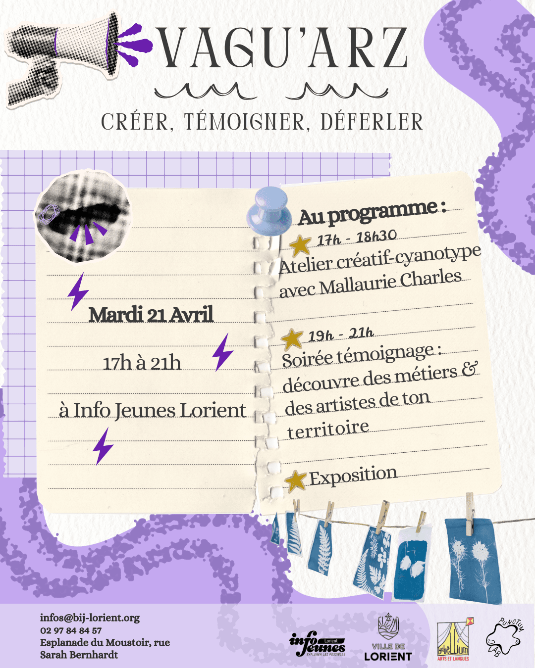 Viens découvrir et t’interroger sur les inégalités dans le milieu de la culture : place des femmes, place des minorités… Une journée pour réfléchir, échanger et sensibiliser ensemble. 📍 Rendez-vous le 21 avril à Info Jeunes Lorient, de 17h à 21h Au programme : À 17h – Ateliers participatifs : Informe-toi, crée et questionne-toi Sors ta créativité et réalise ton cyanotype avec Mallaurie Charles Découvre et échange autour de l’exposition « Je, Tu, Il, Elle, Nous » de Léa Molinier, avec les associations PonctumLab et Babelium (Quimperlé) Discute avec l’équipe d’Info Jeunes autour des questions d’inclusion et profite de la documentation À partir de 19h – Soirée témoignages Rencontre et échange avec des professionnel·les et artistes de ton territoire Les deux temps seront accompagnés d’un goûter et d’un buffet convivial Événement ouvert à toutes et tous – Entrée libre 🤝 Ce projet est mis en place dans le cadre d’un projet commun des volontaires en service civique d’Info Jeunes Lorient et d’une volontaire du Corps européen de solidarité. On vous attend nombreux·ses ! 💫
