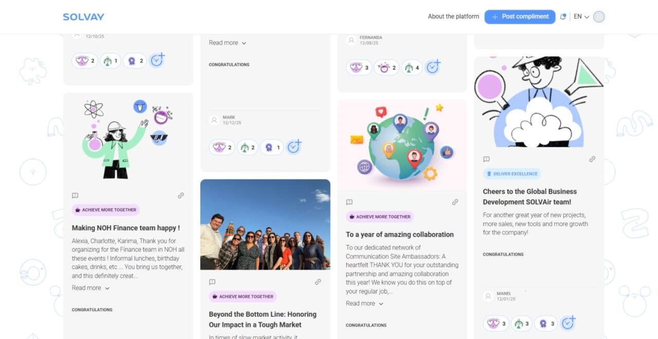 What if saying “thank you” became our favorite resolution? 📣 At Solvay recognition matters. The Table of Compliments is our way to celebrate colleagues and recognize the great work that often goes unnoticed. A positive platform to strengthen connection, engagement and team spirit. 🙏 On World #ThankYouDay, we recognized the people who make Solvay a great place to grow. You might just make someone’s day! “What surprised me the most was receiving compliments for behind the scenes achievements, work that usually goes unseen. It made me feel incredibly recognized and valued!” — Zita Saraiva, Administration