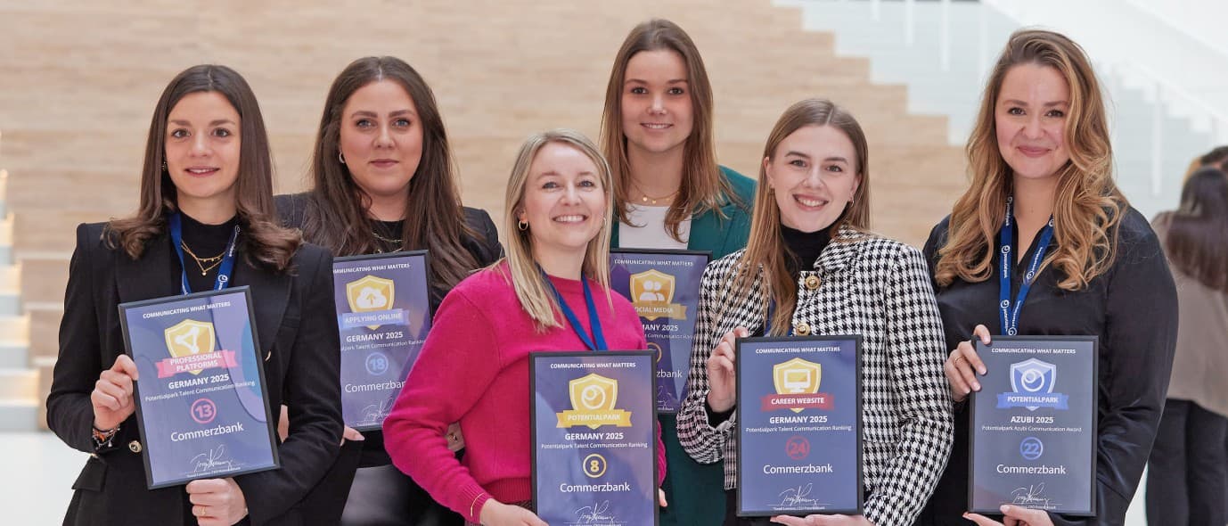Wir gehören zu den TOP 10 der Arbeitgeber in Deutschland! 😍 Im Februar 2025 fand das jährliche Potentialpark Summit Germany statt, das führende Expert*innen und Personalverantwortliche rund um das Thema Rekrutierung und Arbeitgeberattraktivität zusammenbringt. In diesem Rahmen wurde auch das Potentialpark-Ranking 2025 veröffentlicht, in dem wir als Commerzbank im Gesamtranking um 50 Plätze gestiegen sind und nun einen starken achten Platz (von 147) belegen. 🏅 Insgesamt konnten wir uns in den vier Kategorien „Career Page, Social Media, Professional Platforms und Applying Online“ um über 200 Plätze verbessern und können stolz belegen: Wir sind und bleiben ein attraktiver Arbeitgeber. 😎