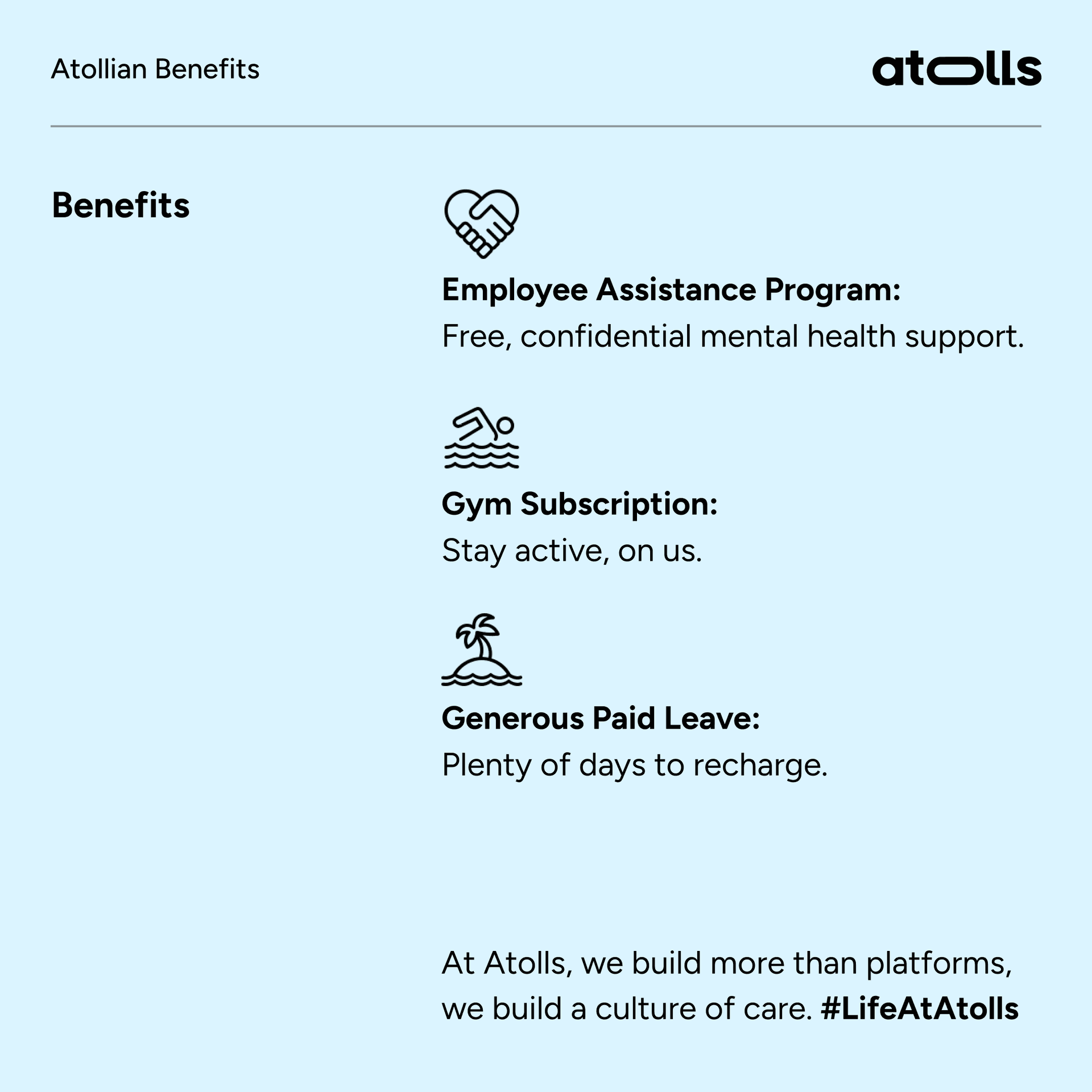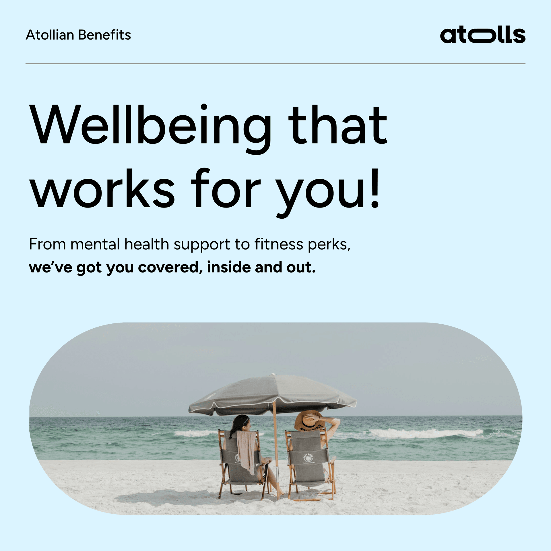 At Atolls, we know that thriving at work also means taking care of ourselves outside of it. That’s why we offer things like an Employee Assistance Program for mental health support 🧠, the option to take sabbatical leave for longer breaks when needed ⏳, and a generous vacation plan to help people fully disconnect and recharge 🌴