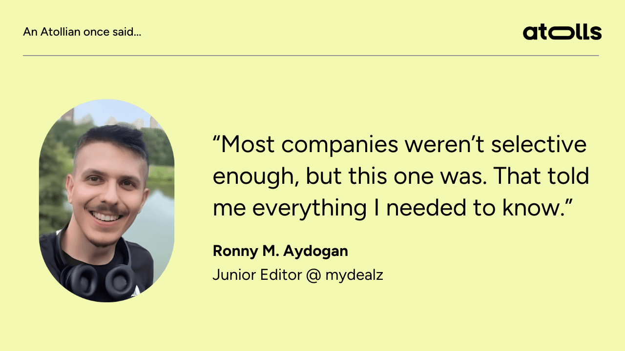 👋 Meet Ronny, Junior Editor at mydealz, whose path to Atolls was anything but ordinary, and that’s exactly why we wanted to share it.