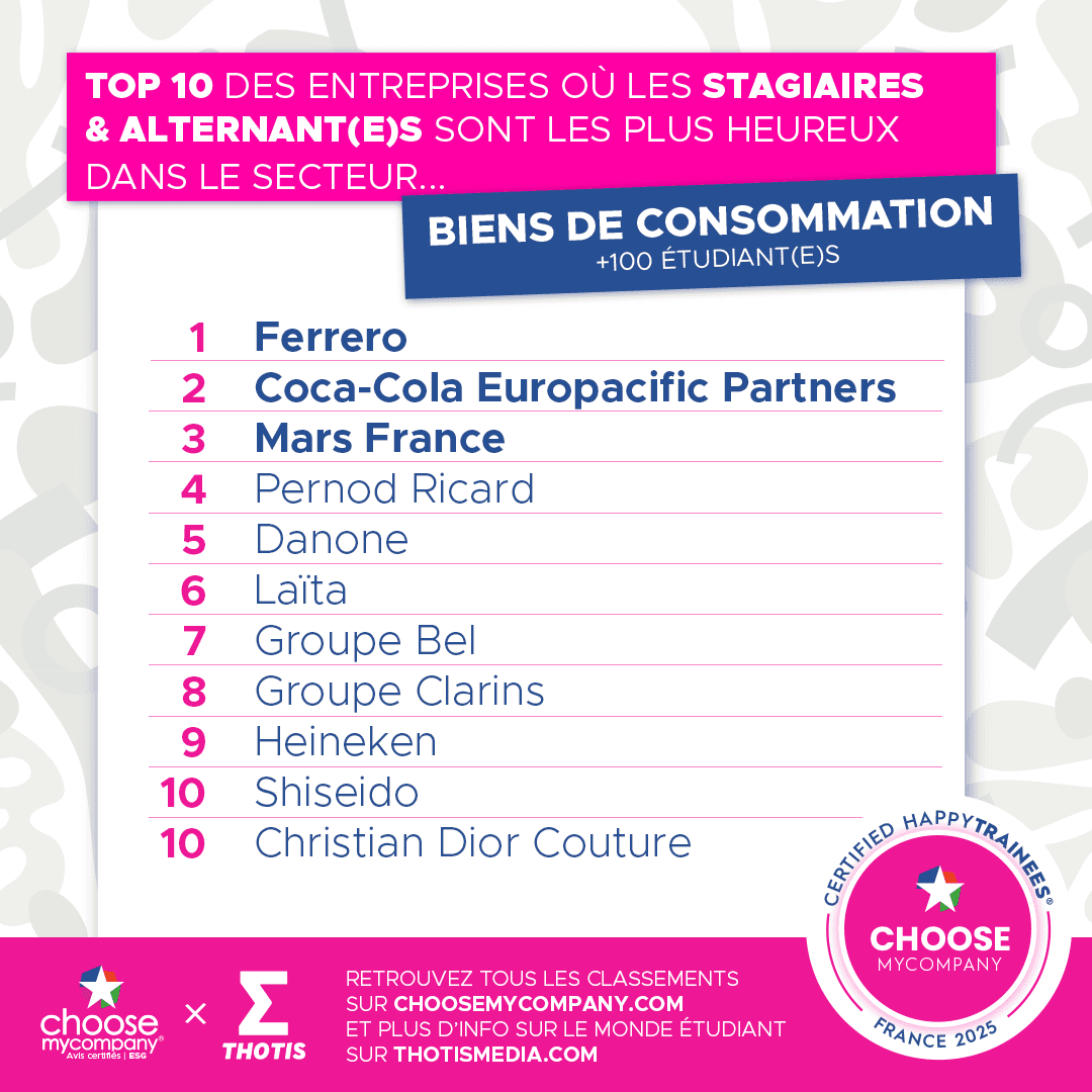 Ferrero se hisse à la 1ère place du classement Focus HappyIndex®Trainees ChooseMyCompany dans le secteur des biens de consommation où 𝐥𝐞𝐬 𝐬𝐭𝐚𝐠𝐢𝐚𝐢𝐫𝐞𝐬 𝐞𝐭 𝐚𝐥𝐭𝐞𝐫𝐧𝐚𝐧𝐭(𝐞)𝐬 𝐬𝐨𝐧𝐭 𝐥𝐞𝐬 𝐩𝐥𝐮𝐬 𝐡𝐞𝐮𝐫𝐞𝐮𝐱.ses ! 🙌
