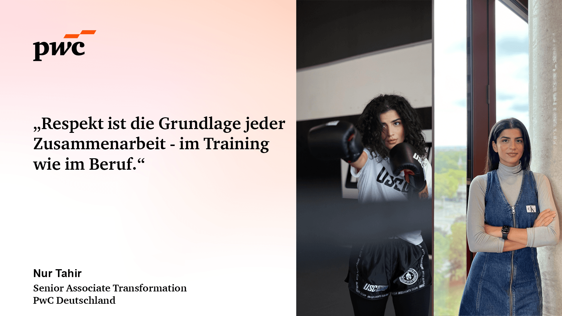 Was mich im Boxring stark macht, trägt mich auch durch den Projektalltag: Fokus, Disziplin und Präsenz.  Boxen ist für mich kein Ausgleich neben dem Job, sondern meine Energiequelle. Mit klaren Strukturen und gutem Zeitmanagement verbinde ich Training und Beruf ganz bewusst. Der Sport erdet mich, gibt mir Klarheit und hilft mir, auch im Arbeitsalltag ruhig und fokussiert zu bleiben.  Gerade in anspruchsvolleren Phasen unterstützen mich Bewegung und kurze, bewusste Pausen dabei, dranzubleiben und langfristig leistungsfähig zu sein.  Als Trainerin im Kampfsport arbeite ich viel mit Kindern und Menschen in herausfordernden Situationen. Empathie, Respekt, Vertrauen und Verantwortungsbewusstsein sind für mich dabei essenziell. Werte, die ich genauso in meine Arbeit bei PwC Deutschland einbringe.  Denn egal ob im Projektteam oder im Boxtraining: Nachhaltige Erfolge entstehen nur gemeinsam.