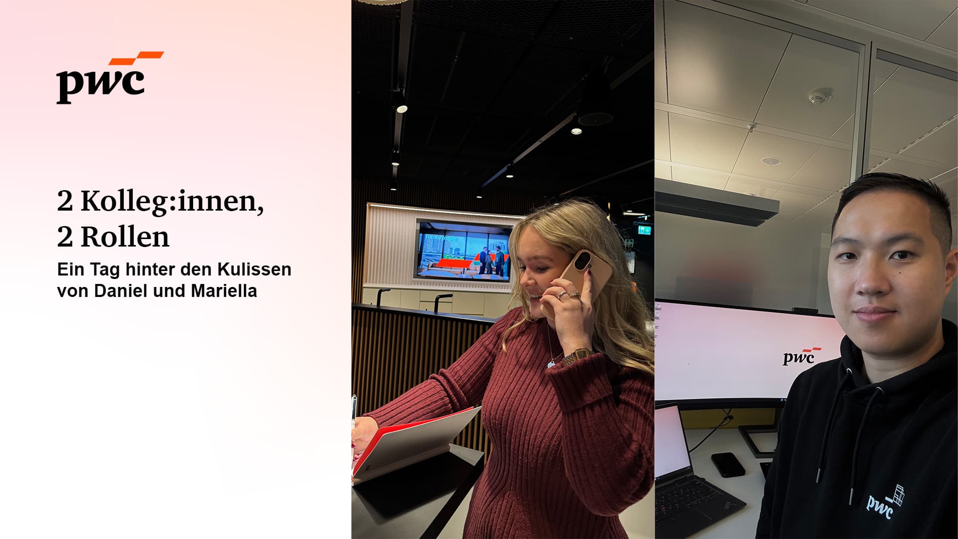 Bei PwC Deutschland treffen viele unterschiedliche Karrierewege aufeinander und trotzdem gibt es im Alltag oft überraschend viele Gemeinsamkeiten. Heute nehmen wir euch mit hinter die Kulissen! Daniel Nguyen, Associate im Bereich Risk & Regulatory, und Mariella Urban, duale Studentin im Bereich Tax, zeigen euch, wie ihre Rollen aussehen: zwei unterschiedliche Bereiche, aber ein Arbeitsalltag, der sich in vielen Momenten ähnelt, geprägt von Teamwork, Lernkurven und spannenden Projekten. Daniel, Associate im Bereich Risk & RegulatorMariella, duale Studentin im Bereich Tax 08:00 Uhr - Ankunft im Frankfurter Office 08:00 Uhr - Ankunft im Düsseldorfer Office 09:00 Uhr - Teammeetings09:00 Uhr - Teammeetings 10:30 Uhr - Focus Time10:30 Uhr - Kick Off Jahresabschluss 202512:00 Uhr - Lunch Time 12:00 Uhr - Lunch Time 12:30 Uhr - Billard mit Kolleg:innen12:30 Uhr - Kaffeepause15:00 Uhr - Abstimmung mit dem Team15:00 Uhr - Rücksprache mit dem Finanzamt17:30 Uhr - Feierabend 17:30 Uhr -  Feierabend 19:00 Uhr - Auspowern im Gym 19:00 Uhr - Auspowern im Gym   Du willst mehr über die vielfältigen Möglichkeiten bei PwC Deutschland erfahren? Schau auf unserer Karriereseite vorbei!