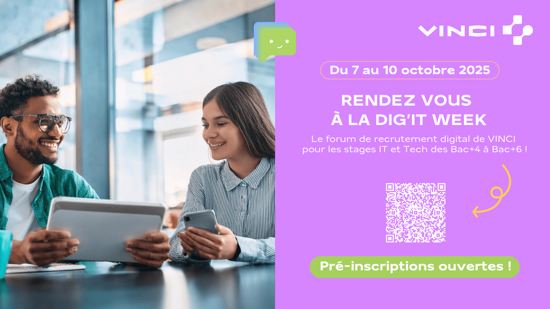 Un forum de recrutement 100% digital, dédié aux étudiants en quête d’un stage de fin d’études dans l’IT et le digital. 📅 Quand ? Du 7 au 10 octobre 2025 💻 Où ? En ligne, sur la plateforme Seekube 🎓 Pour qui ? Les étudiants souhaitant rejoindre VINCI dans les domaines : Cybersécurité 🔐 Intelligence Artificielle 🤖 Data 📊 Conduite du changement 🔄 Infrastructures 🖥️ Développement & Applications 💡 ✨ À partir du 16 septembre, les candidats pourront consulter et postuler aux offres de stage disponibles. 👉 Les préinscriptions sont déjà ouvertes ici : Pré-inscription 📅 Dès le 7 octobre, nos recruteurs seront mobilisés pour proposer des entretiens à distance et répondre à toutes vos questions. 🚀 L’an dernier, plus de 600 étudiants ont participé à l’événement. 🙌 Ne manquez pas l’occasion : découvrez nos offres et préparez vos entretiens dès le 16 septembre.