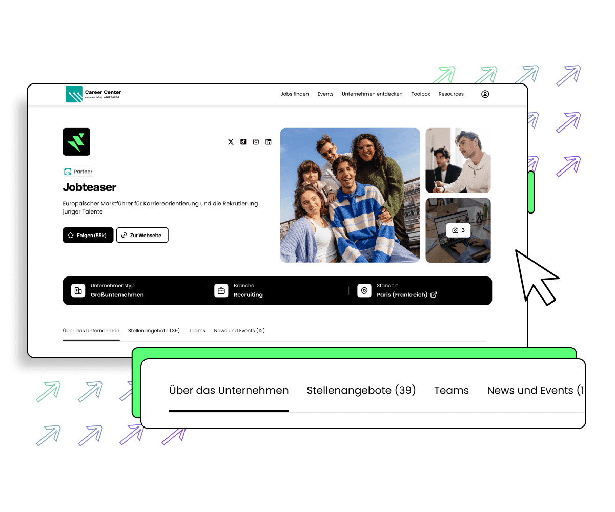 - Aufmerksamkeit erzielen – Mit einer Seite, die Ihre Unternehmenskultur und Ihre Angebote zeigt. Sichtbar in den Karrierebereichen von über 800 Partnerhochschulen und auf JobTeaser.com