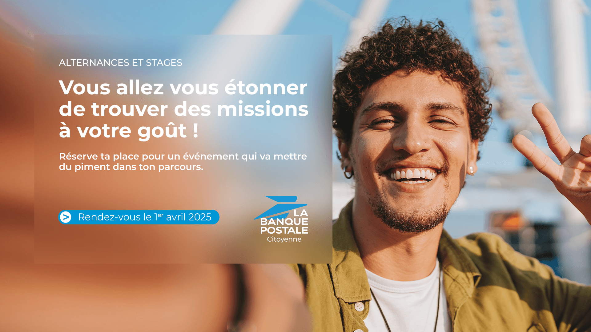 Pour l’occasion, nous venons à votre rencontre : Le 25 septembre à l’afterwork audit et France de l’Université Paris-Dauphine - Campus Paris Dauphine (Paris 16ème) Du 26 septembre au 16 octobre au forum Banque Talents Handicap - distanciel : Forum Banque Le 04 novembre au finance et audit day de l’EDHEC – Campus de Lille (Roubaix) Le 6 novembre au Jobdating finance, audit et actuariat du Pôle Léonard de Vinci – Campus de la Défense (Courbevoie) Le 18 novembre au forum audit et consulting day de SKEMA -Campus Grand Paris (Suresnes) Le 19 novembre au forum des entreprises de l’ENSAI – Campus de Ker Lann (Bruz) Le 4 décembre au forum généraliste du Pôle Léonard de Vinci – Campus de la Défense (Courbevoie) Le 4 décembre au forum EFREI 4 good de l’EFREI - Campus Villejuif Certaines offres sont encore à pourvoir, rendez-vous sur notre site labanquepostale.com. À très vite sur votre campus !