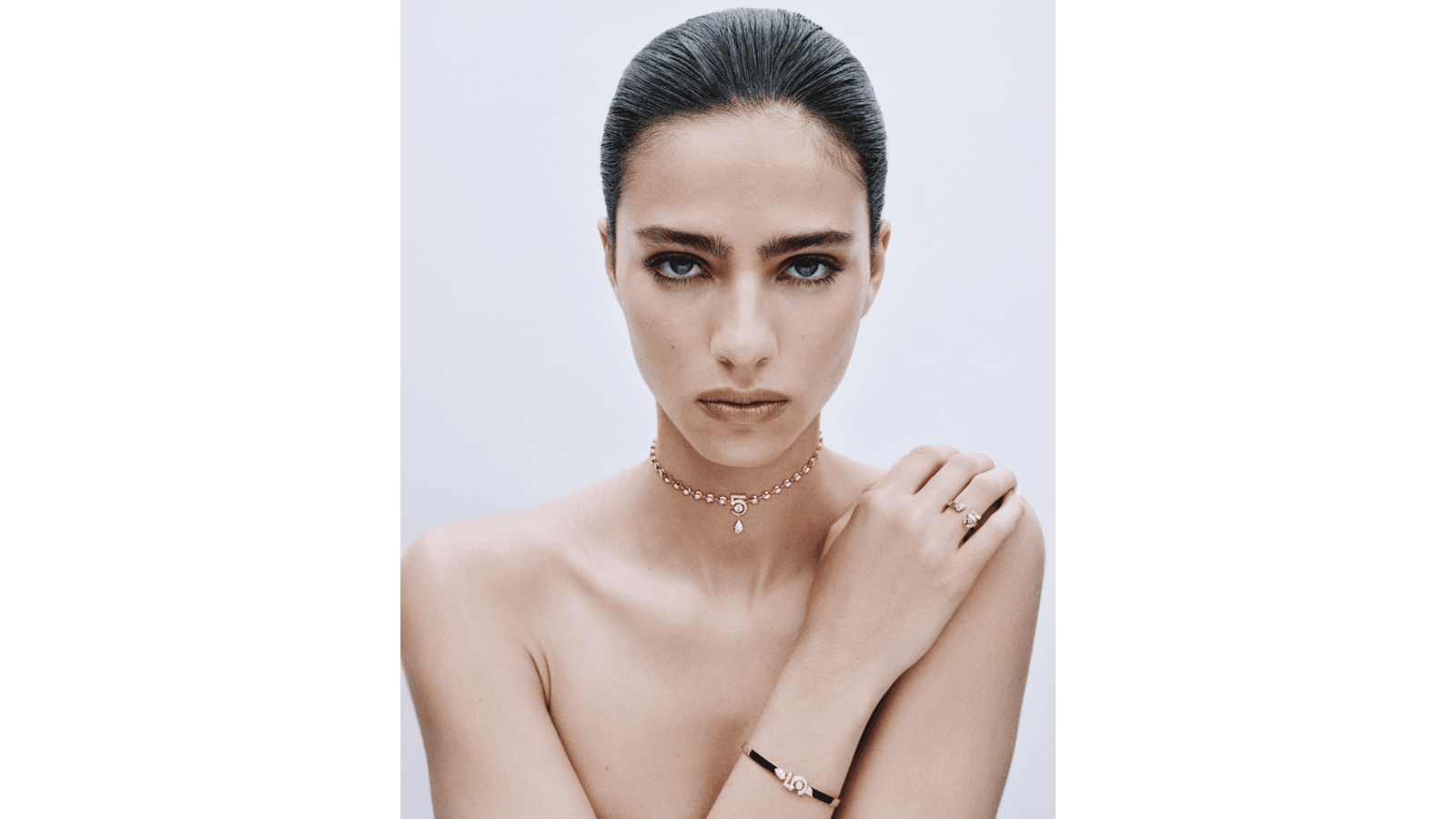 Faisant écho au vocabulaire stylistique transmis par Gabrielle Chanel dans sa collection « Bijoux de Diamants » en 1932, le collier explore deux portés : le ras-de-cou et le choker, pour porter haut sa féminité. Au centre, le chiffre fétiche de Mademoiselle, entièrement serti de diamants, retient dans sa courbe un diamant de centre de 0,30ct certifié par le GIA. La ligne de diamants se décline également en version bracelet, dont le fermoir est caché au cœur du 5.