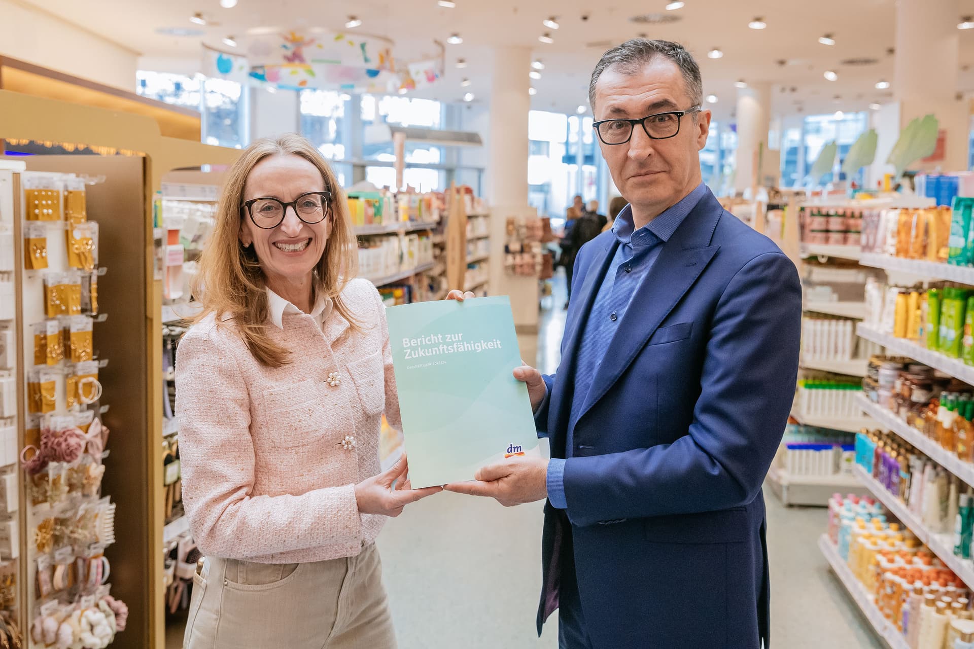 dm-Geschäftsführerin Kerstin Erbe überreichte ihm zudem das erste Exemplar des heute erscheinenden Nachhaltigkeitsberichts von dm. Der Bericht zur Zukunftsfähigkeit 2023/24 fasst erstmals die nachhaltigen Aktivitäten aller 14 dm-Länder zusammen.