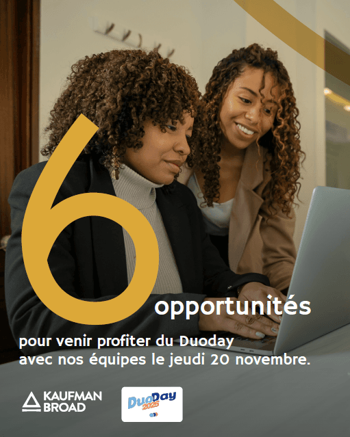 Le jeudi 20 novembre 2025, Kaufman & Broad participera à l’édition 2025 du DuoDay, une journée nationale dédiée à l’inclusion des personnes en situation de handicap dans le monde professionnel. À cette occasion, nos équipes accueilleront 6 personnes pour une immersion d’une journée au sein de différents métiers de la promotion immobilière. 🔎 Postes proposés : Gestionnaire de la relation client – Toulouse Chargé(e) des opérations marketing digital – Courbevoie Gestionnaire de la relation client SAV – Courbevoie Directeur(trice) de programmes immobiliers – Rennes Assistant(e) / Chargé(e) de communication – Courbevoie Chargé(e) de paie / RH – Courbevoie 💻 Pour postuler : rendez-vous sur www.duoday.fr, recherchez les offres « Kaufman & Broad » et déposez votre CV. Nous sommes impatients d’accueillir les participants pour leur faire découvrir nos métiers et nos engagements.