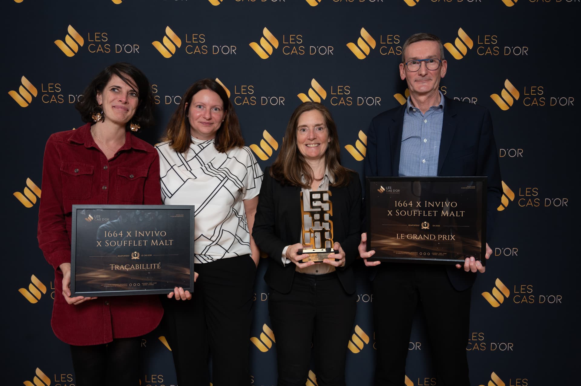 Marion Felix souligne le caractère pionnier de la démarche : grâce à cette technologie Blockchain et la traçabilité qu’elle apporte, nous pouvons, par l’intermédiaire d’un QR code sur nos bouteilles de 1664 Blonde, donner la possibilité aux consommateurs de retracer le parcours de la bière, du champ à la dégustation, et d’offrir aux consommateurs une expérience digitale immersive. Plus de 370 000 utilisateurs ont déjà scanné le QR Code et sont restés en moyenne 2mn connectés. Un grand merci au jury des Cas d’Or, à tous nos partenaires pour leur confiance !
