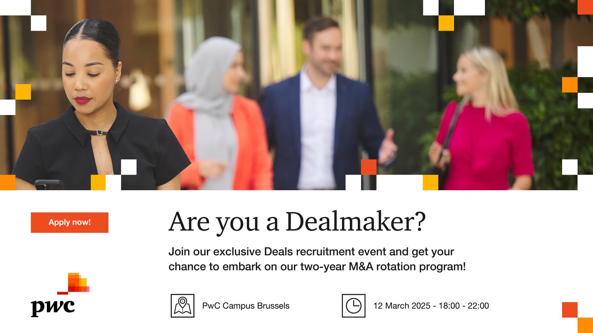 PwC invites you to dive into the captivating realm of Deals during a very exclusive event at our Brussels Campus. This unique opportunity will allow you to explore the dynamic world of M&A, gain insights from industry leaders, and experience firsthand the innovative culture that drives our success!