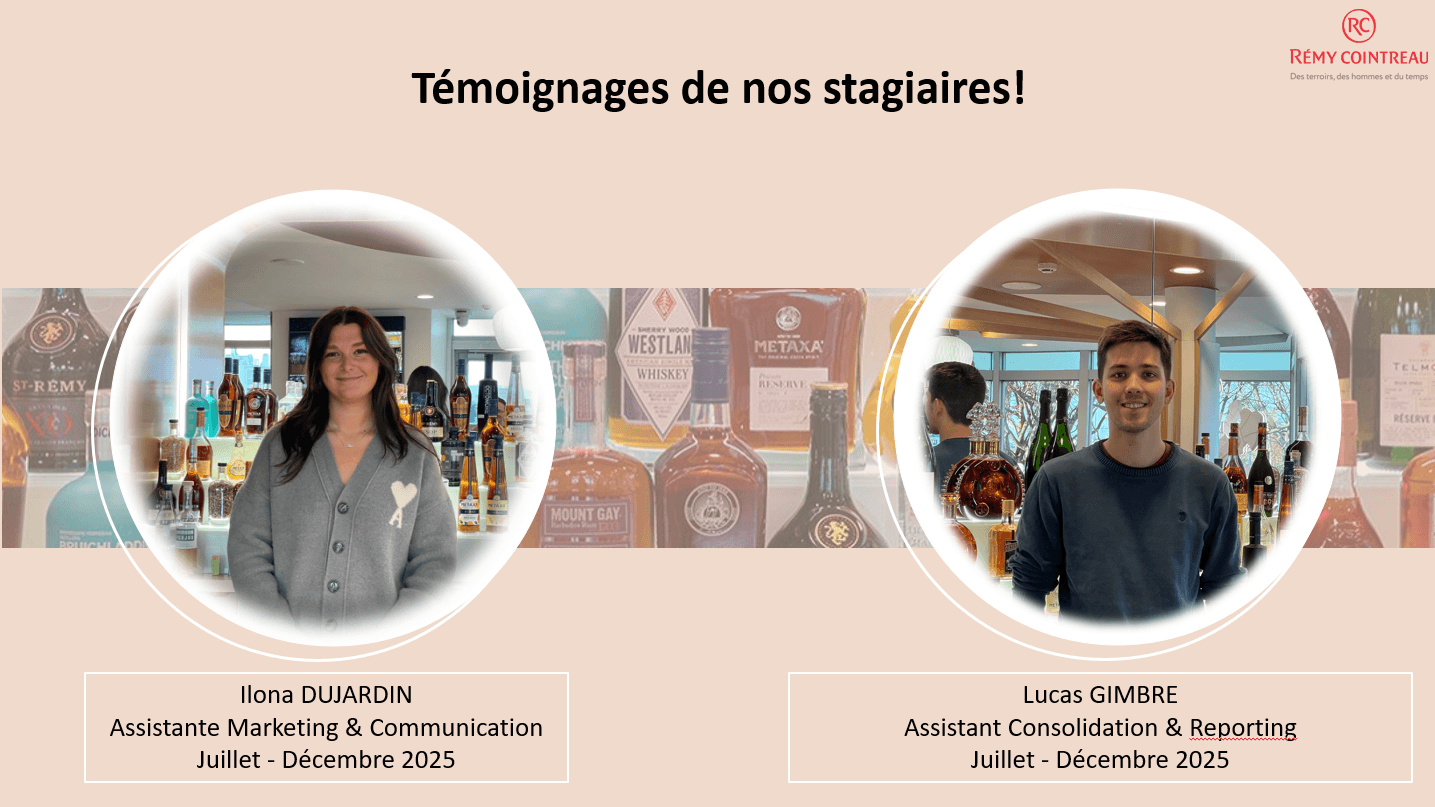 Voici ci-dessous les témoignages d'Ilona DUJARDIN, stagiaire Assistante Marketing & Communication au sein de Maison Psyché, et de Lucas GIMBRE, Assistant Consolidation & Reporting. Leurs récits vous permettront de découvrir l’expérience Rémy Cointreau de l’intérieur. Pourquoi avoir choisi de rejoindre Rémy Cointreau ? ID : J’ai rejoint Rémy Cointreau pour intégrer un groupe français à dimension internationale, reconnu pour ses marques emblématiques tout en conservant une culture d’entreprise à taille humaine. À l’origine, j’avais postulé pour un autre stage au sein du groupe, mais une opportunité s’est présentée dans une Maison en lien avec mon master spécialisé dans le luxe. Après l’entretien, j’ai été immédiatement séduite par l’univers et le positionnement de la Maison. LG : J’ai rejoint Rémy Cointreau dans le cadre de mon stage de fin d’études, avec la volonté d’intégrer un groupe international et coté en bourse. Travailler dans un groupe international de cette envergure est particulièrement formateur en finance, notamment en raison des enjeux liés aux volumes, aux stocks et à la cotation. C’était pour moi l’opportunité de découvrir une finance d’entreprise plus stratégique et exigeante. Quel est ton parcours ? ID : J’ai suivi un Bachelor en Global Management en Belgique, en cursus bilingue français-anglais. Souhaitant me spécialiser dans le luxe, j’ai poursuivi avec un master en Luxury Management, incluant une expérience internationale avec un semestre à New York et un semestre à Paris. Ce parcours m’a permis de développer une vision internationale du secteur du luxe. LG : Après un DUT en France, j’ai poursuivi avec un Bachelor en administration des affaires à HEC Montréal, au Canada. J’ai ensuite réalisé un an de stage en contrôle de gestion dans un cabinet de conseil, avant d’intégrer un master spécialisé en finance d’entreprise, incluant une expérience professionnelle significative. Comment décrirais-tu ton expérience chez Rémy Cointreau ? ID : Mon expérience a été très enrichissante, notamment parce que j’ai évolué dans une structure à taille humaine offrant des missions variées. L’ambiance est conviviale et bienveillante, et j’ai eu l’opportunité de collaborer avec différentes équipes et Maisons du groupe, ce qui m’a permis d’avoir une vision globale de son fonctionnement. LG : Mon expérience a été très enrichissante. J’ai bénéficié d’une forte autonomie et de responsabilités réelles, tout en étant accompagné par des équipes expérimentées. Les missions sont variées, à la fois techniques et analytiques, ce qui permet de monter rapidement en compétences et de mieux comprendre les enjeux financiers d’un groupe international. Quels conseils donnerais-tu aux prochains stagiaires et alternants ? ID : Je leur conseillerais d’oser aller vers les autres, quel que soit leur niveau hiérarchique, et de poser des questions dès que nécessaire. La communication est essentielle pour apprendre rapidement et progresser, surtout dans un environnement aussi riche et collaboratif. LG : Je leur conseillerais de prendre le temps d’écouter et d’apprendre des équipes, car de nombreux collaborateurs disposent d’une grande expérience. Il ne faut pas hésiter à poser des questions et à s’intéresser aux enjeux stratégiques du groupe. De quelle valeur du Groupe te sens-tu le/la plus proche ? ID : Je me reconnais particulièrement dans la valeur du People. Les échanges sont simples, humains et bienveillants, ce qui favorise l’apprentissage et permet de créer rapidement des liens au sein des équipes. LG : Je me sens particulièrement proche de la valeur du Temps. Chez Rémy Cointreau, la performance s’inscrit dans une vision long terme, notamment en raison de la durée de maturation des produits. Cette approche invite à dépasser le court terme et à raisonner sur des horizons stratégiques plus larges. English Version: Why did you choose to join Rémy Cointreau? ID: I joined Rémy Cointreau to gain experience within a French group with a strong international presence, known for its iconic brands while maintaining a human-sized corporate culture. I was initially applying for another internship within the Group, but an opportunity arose within a Maison that perfectly matched my luxury-focused academic background. After the interview, I was immediately convinced by the Maison’s universe and positioning. LG: I joined Rémy Cointreau for my end-of-studies internship, with the desire to integrate an international, publicly listed group. Working in an international group of this scale is particularly formative in finance, especially due to the challenges related to volumes, stocks, and listing. It was an opportunity for me to discover a more strategic and demanding corporate finance. What is your background? ID : I followed a Bachelor in Global Management in Belgium, in a bilingual French-English program. Wanting to specialize in luxury, I continued with a Master in Luxury Management, including an international experience with one semester in New York and one semester in Paris. This journey allowed me to develop an international vision of the luxury sector. LG : I started with a DUT in France, followed by a Bachelor in Business Administration at HEC Montréal, in Canada. I then completed one year of internship in management control within a consulting firm, before joining a specialized master’s degree in corporate finance, which included a significant professional experience. How would you describe your experience at Rémy Cointreau? ID: My experience has been very enriching, particularly thanks to the diversity of missions within a human-sized structure. The working environment is friendly and supportive, and I had the opportunity to collaborate with various teams and Maisons across the Group, giving me a broader understanding of its op