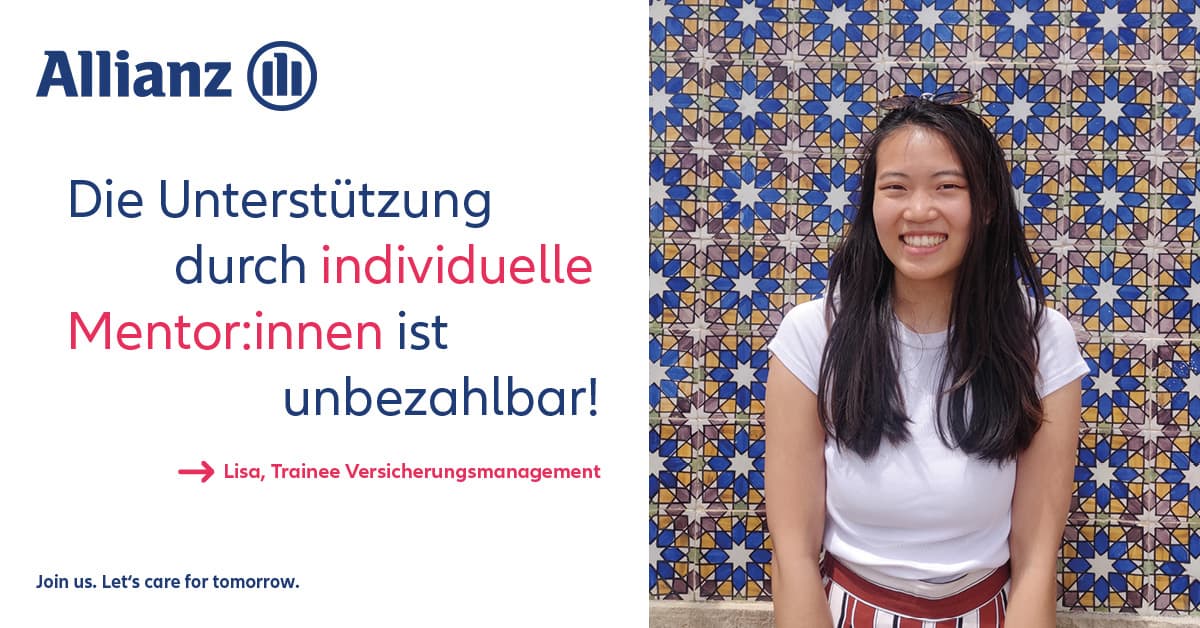 „Warum ich mich für das Traineeprogramm Versicherungsmanagement bei der Allianz entschieden habe? Ganz einfach: Die Aussicht auf berufliche Vielfalt, eine steile Lernkurve und persönliche Weiterentwicklung haben mich überzeugt. Ein internationaler Konzern wie die Allianz bietet den perfekten Start ins Berufsleben. Auf das Programm aufmerksam geworden bin ich übrigens auf einer Messe in München.“, sagt Lisa.