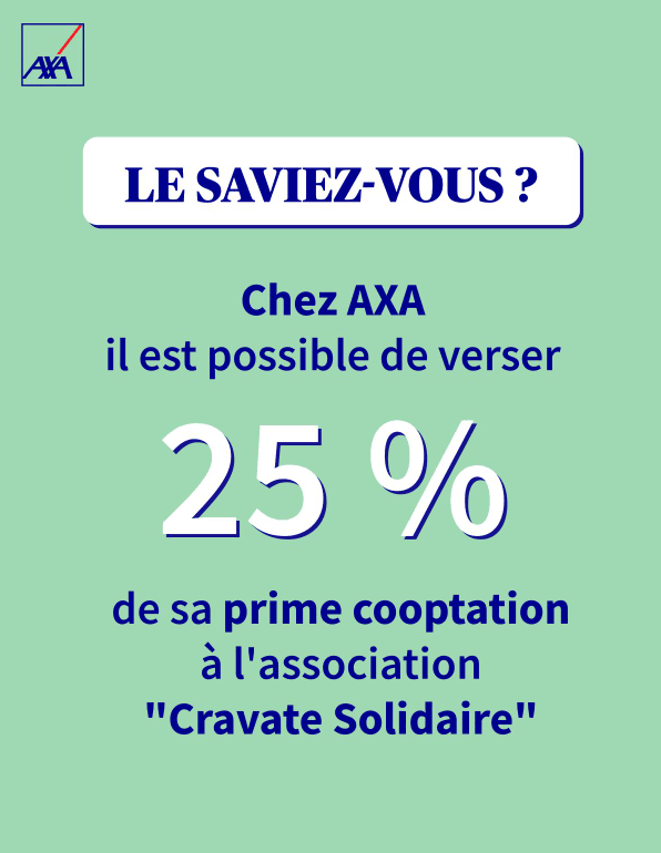 Chez AXA France, nous croyons en la force du collectif pour attirer les meilleurs talents. Nos collaborateurs sont nos meilleurs ambassadeurs : ils incarnent chaque jour nos valeurs et nos métiers. Grâce à notre programme de cooptation, ils peuvent recommander un talent, renforcer nos équipes… et recevoir jusqu’à 2 000 € de prime. 🚀 Mais ce n’est pas tout. Ils ont aussi la possibilité de faire un geste solidaire en reversant une partie de cette prime à La Cravate Solidaire Paris, pour soutenir l’insertion professionnelle. Et AXA France s’engage à leurs côtés avec un abondement de 40 % sur le don.