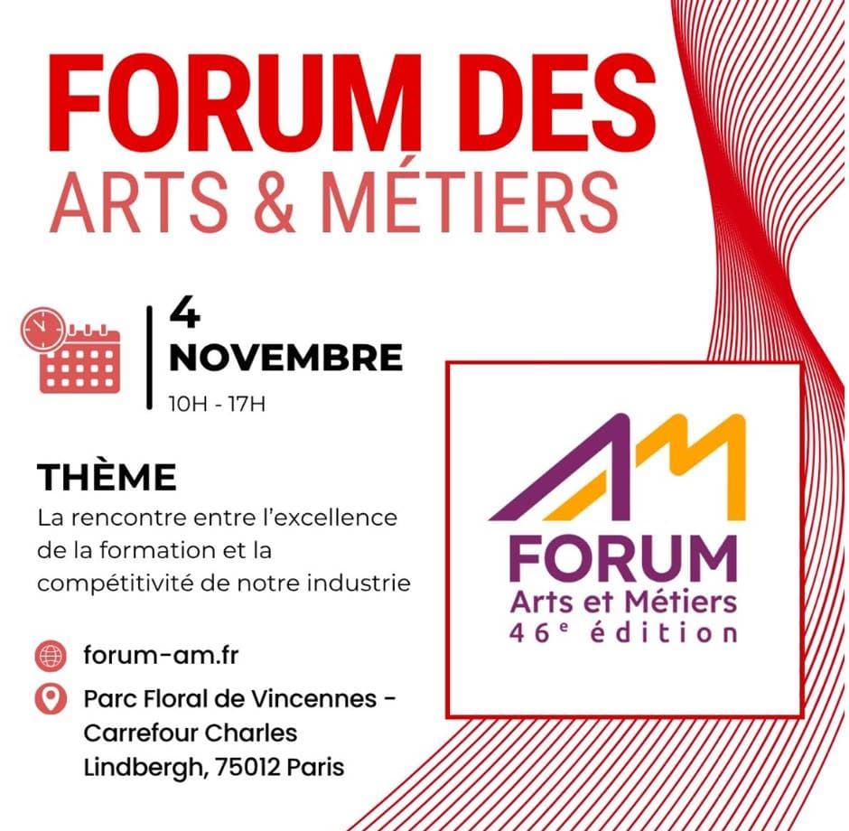 Rendez-vous le mardi 4 novembre 2025 pour la 46ème édition du @Forum Arts et Métiers au Parc Floral de Vincennes (75). Le temps d'une journée, cet événement organisé par l’@Union des Élèves - Arts et Métiers et la @FONDATION ARTS ET METIERS permet à plus de 4 000 étudiants et jeunes diplômés de décrocher un stage, une alternance ou un emploi.   Plus d‘information : Ici   #GadzArts #DassaultAviation #EnsemblePlusLoin