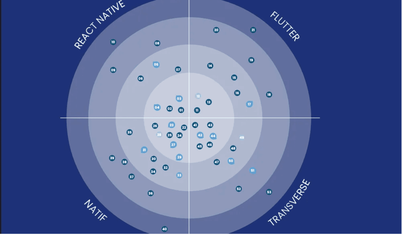 Inspiré du retour d’expérience de notre quotidien et co-construit par notre comité de contenu composé de 13 experts, notre Tech Radar est le premier à présenter un focus 100% mobile. Découvrez notre troisième édition ! Téléchargez le 3ème volume de notre Tech Radar Retrouvez l'avis de nos experts sur les techniques, plateformes, outils, langages et frameworks associés aux principales technologies mobiles que nous utilisons au quotidien chez Theodo Apps : React Native, Flutter et Native.