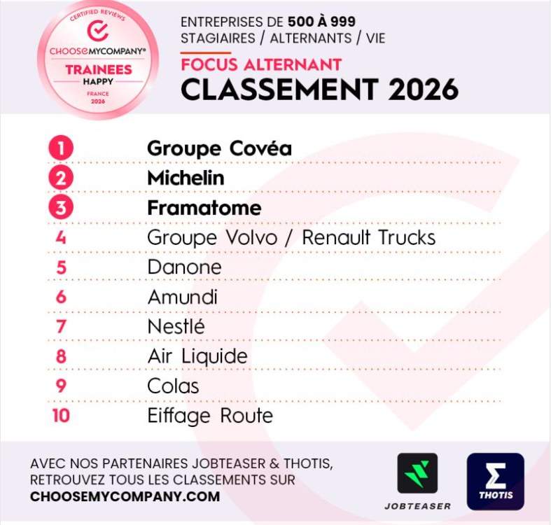 Nos 480 alternants, pour leurs retours enthousiastes et leur implication au quotidien, nos tuteurs, qui accompagnent avec passion, donnent du sens aux missions et valorisent les talents de demain. Et nos équipes RH, qui œuvrent dans l’ombre pour garantir un accueil et un accompagnement de qualité.