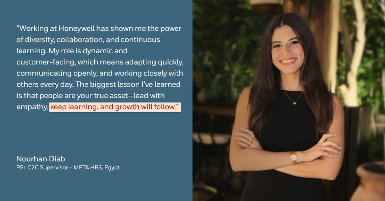Nourhan Diab has been part of Honeywell for nine months as a Senior C2C Supervisor in META HBS, bringing over eight years of experience to a fast-paced, customer-facing role. What excites Nourhan most is Honeywell’s diversity and global mindset—working across cultures and time zones as one team, without borders. Continuous transformation and learning are part of everyday work, with a strong focus on ownership, accountability, and turning challenges into solutions. The role is dynamic and demanding, requiring close collaboration with customers and cross-functional teams across a rapidly changing META market. Adaptability and openness to change are key. Her key career lesson: keep an open mind, never stop learning, and lead with empathy—because people are your greatest asset. Ready to shape the future of industry? Explore opportunities at Honeywell: Follow Honeywell on social media:  Youtube: /honeywell LinkedIn:   / honeywell   Twitter:   / honeywell    Facebook:   / honeywell    Instagram:   / honeywell    Learn more:  Careers at Honeywell: https://careers.honeywell.com/ The latest stories about our technology and people: https://www.honeywell.com/us/en/news The future is what we make it: https://www.honeywell.com/us/en/future