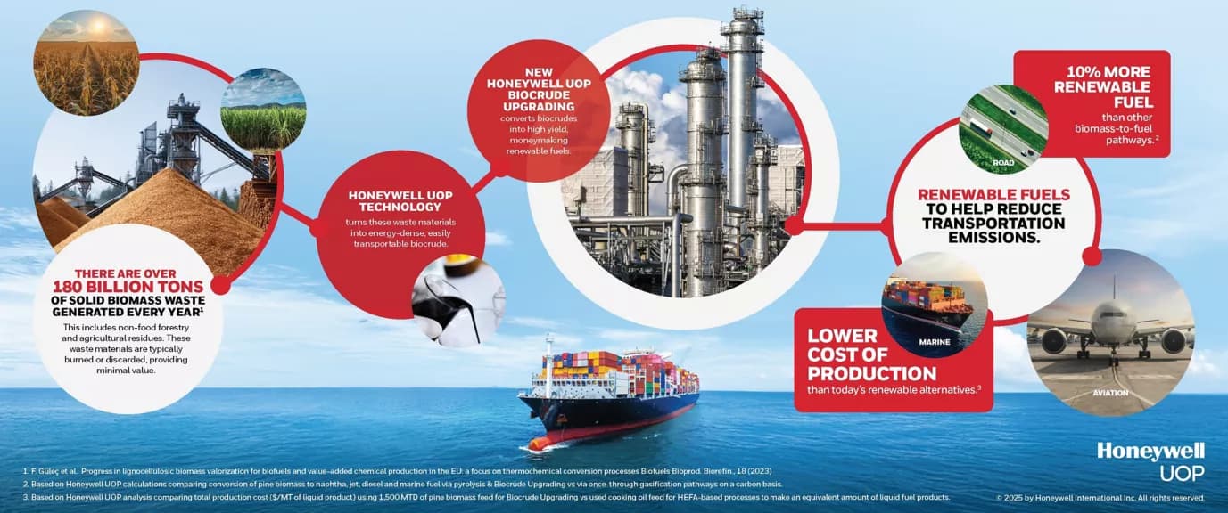 Biofuels are becoming a big part of the global push for cleaner energy, and Honeywell’s Biocrude Upgrading Technology shows how waste materials can be transformed into fuels that power ships, planes, and cars. What’s Happening? The process starts with biomass — things like leftover wood or crop residues — and converts it into renewable fuels.  These fuels are called “drop-in” replacements because they work with existing engines and infrastructure without needing big changes.  In short, it’s a way of turning waste into usable energy! Why It Matters 🌍 Lower emissions: Renewable marine fuel can cut greenhouse gas emissions by up to 70% compared to conventional fuels. Cost-effective: It’s cheaper to produce than older biofuels made from used cooking oil. High efficiency: This process produces about 10% more usable carbon compared to older techniques. Types of Fuels Produced Renewable Marine Fuel – a cleaner energy for ships. Sustainable Aviation Fuel (SAF) – a greener alternative for planes. Renewable Naphtha – can be used to make plastics and chemicals, or mixed into gasoline to make it stronger and more powerful. Key Takeaway🔑 Biofuels aren’t just about recycling waste—they’re about creating a sustainable energy future.  By upgrading biomass into renewable fuels, we can reduce emissions, lower costs, and keep our transport systems running smoothly without relying on fossil fuels.