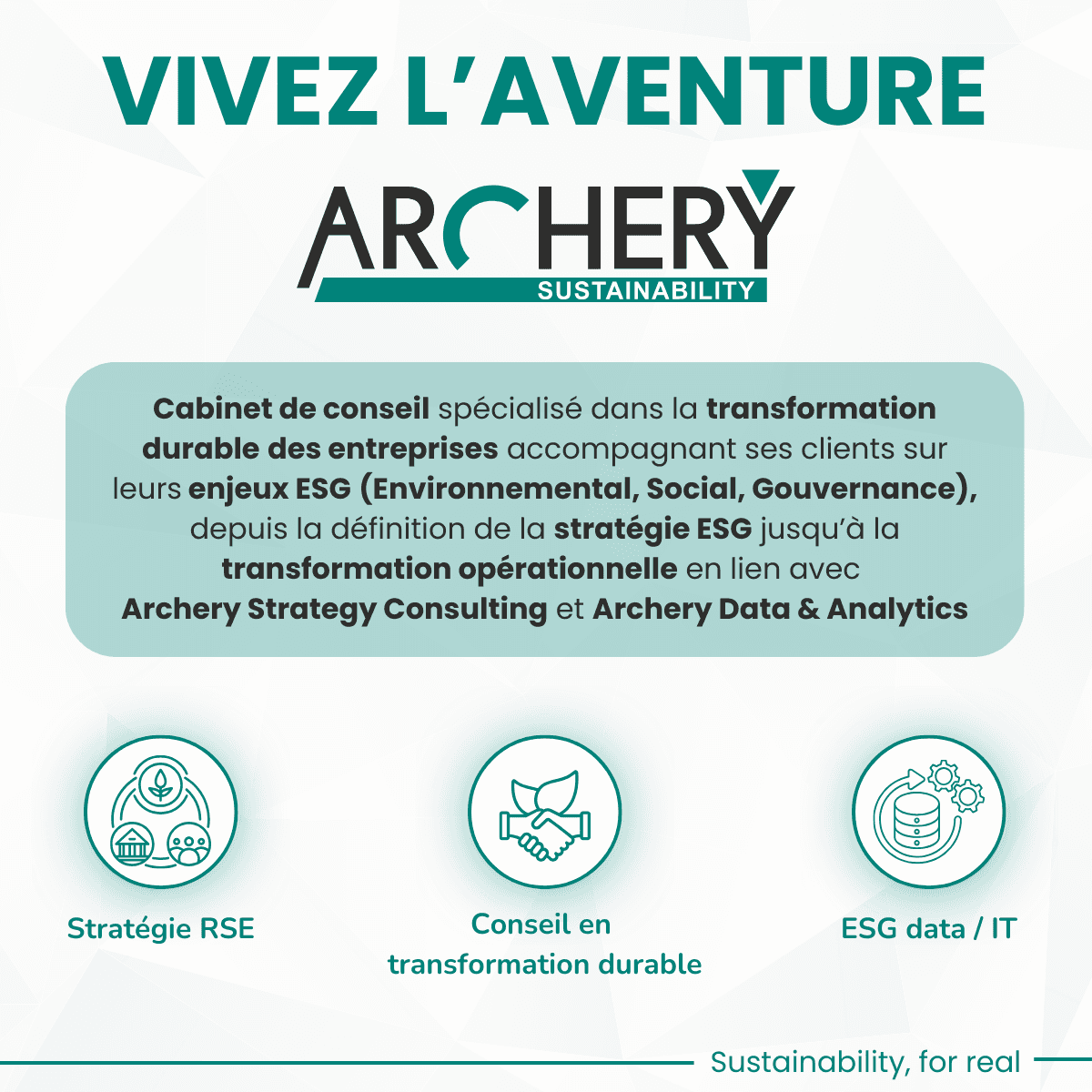 Archery Strategy Consulting crée Archery Sustainability : une nouvelle filiale dédiée à la transformation durable des entreprises ! Archery Strategy Consulting, franchit une nouvelle étape dans son engagement pour un avenir plus responsable. Nous annonçons le lancement d’Archery Sustainability, une filiale entièrement dédiée à l’accompagnement des entreprises sur leurs enjeux Environnementaux, Sociaux et de Gouvernance (ESG). Archery Sustainability vise à proposer un conseil stratégique à impact, alliant exigence, créativité et pragmatisme, pour permettre aux entreprises de se transformer durablement. Elle intervient à toutes les étapes : de la définition d’une stratégie RSE cohérente jusqu’à sa mise en œuvre concrète. Ce lancement s’inscrit dans la continuité des valeurs d’Archery et de ses secteurs historiques (aéronautique-défense, transport-logistique, énergie), avec la volonté de faire des enjeux ESG un levier de performance et de transformation au service des dirigeants. À la tête de cette nouvelle entité : Carole Davies-Filleur, experte reconnue du conseil en transformation durable, forte de plus de 25 ans d’expérience en Direction Générale et en conduite du changement. Elle apporte une vision stratégique et opérationnelle unique, au croisement de la transformation environnementale, de la gouvernance et de la performance. Pourquoi c’est inspirant pour les jeunes diplômé(e)s ? Parce que ce projet montre qu’il est possible de concilier conseil de haut niveau et engagement sociétal fort. Archery Sustainability propose un cadre stimulant pour celles et ceux qui veulent mettre leurs compétences au service de la transition, dans une structure à taille humaine, au sein d’un groupe reconnu pour la qualité de son accompagnement. Basée à Paris, Archery Sustainability souhaite renforcer ses équipes . Si vous êtes animé(e) par les sujets d’impact, que vous cherchez à travailler sur des problématiques stratégiques concrètes et les enjeux environnementaux, ce projet est fait pour vous !