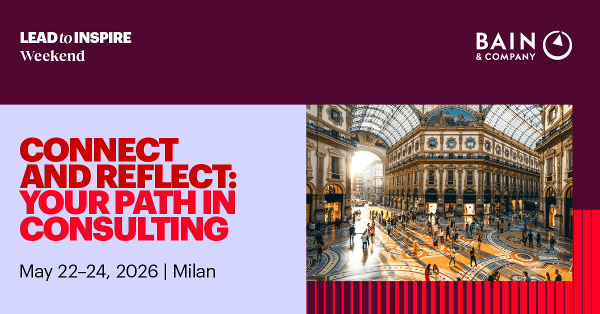 A moment to step back and reflect on your next chapter in consulting. The Lead to Inspire Weekend brings experienced women together in Milan to navigate career growth, grow their network, and gain real insight into Bain and consulting - through open conversations with peers and Bain leaders whose careers reflect a range of paths into consulting and beyond. Travel and accommodation are covered by Bain. Apply by 22 March to join the Lead to Inspire Weekend 2026: