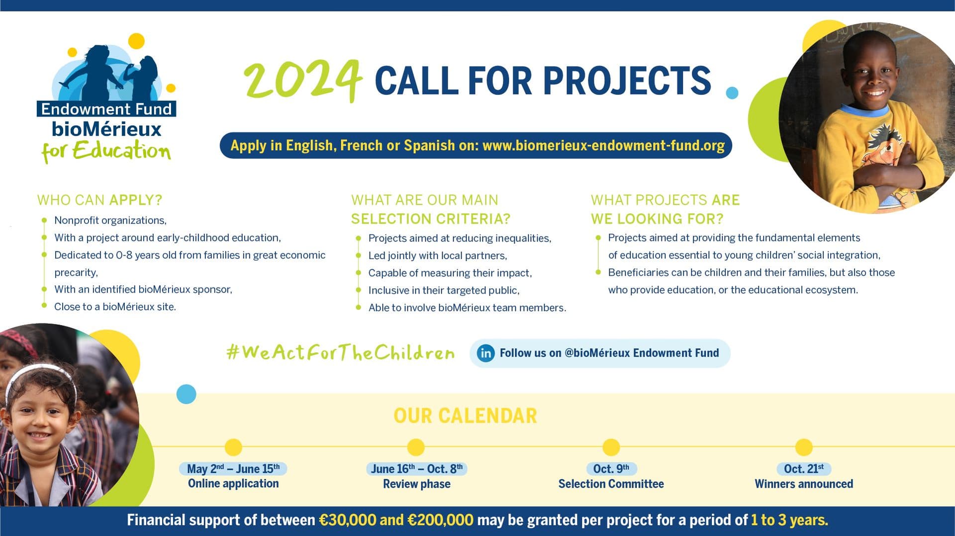 Le Fonds de dotation bioMérieux pour l'Éducation, organisme à but non lucratif créée en 2020 par bioMérieux, est fier de lancer son 3ème Appel à Projets pour soutenir des associations et leurs projets en faveur de l’éducation des jeunes enfants défavorisés (de 0 à 8 ans) à travers le monde !