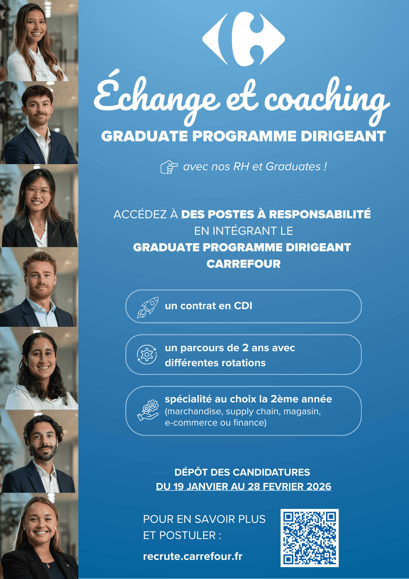 Choisir un Graduate Programme, c’est accepter de sortir de sa zone de confort pour accélérer son apprentissage et construire les bases solides de sa carrière.🧠 Après avoir donné la parole à Simon, nous mettons aujourd’hui en lumière le parcours de Clémence, actuellement en Graduate Program Dirigeant chez Carrefour. Encore en plein cœur du programme, Clémence nous livre un regard à chaud sur cette expérience unique. À travers son témoignage, elle partage son parcours, ses apprentissages et les différentes étapes qui rythment son quotidien depuis un an et demi. 🎓 Son expérience offre un aperçu très concret de ce que permet le Graduate Programme Dirigeant : offrir une vision 360 du groupe en multipliant les immersions, passant du terrain aux fonctions stratégiques tout en contribuant aux enjeux majeurs de chez Carrefour. Cette interview s’adresse à vous, étudiants et jeunes diplômés, qui vous interrogez sur la suite de votre parcours. Elle vous permet de vous projeter à travers le regard d’une collaboratrice qui vit actuellement le Graduate Programme comme un véritable accélérateur de développement personnel et professionnel. ✨ Interview de Clémence Potard - Actuellement en Graduate Program Peux-tu te présenter en quelques mots (formation et parcours avant Carrefour) ? Je m’appelle Clémence Potard, j’ai intégré le Graduate Program Dirigeant de Carrefour en Septembre 2024 après un Master en management international (Master 233) à l’Université Paris Dauphine - PSL et un passage en cabinet de conseil. Comment as-tu entendu parler du Graduate Dirigeant Carrefour et qu’est-ce qui t’a donné envie de candidater ? J’ai découvert le Graduate Program Dirigeant via le Forum de Recrutement de Dauphine, puis lors d’échanges avec des anciens du programme. Ce qui me plaît, c’est avant tout que Carrefour soit une entreprise ancrée dans le réel, qui parle à tout le monde. Chaque français est déjà entré au moins une fois dans sa vie dans un magasin Carrefour. Et j’aime le fait de travailler sur des problématiques très concrètes qui peuvent avoir un impact aussi large. Enfin pour sa dimension internationale : que l’on soit à Tunis, à Buenos Aires ou à Bucarest on peut faire ses courses chez Carrefour. Je trouve ça assez fou ! C’est un point de repère à des milliers de kilomètres de la France. Avant d’intégrer le Graduate Programme, avais-tu une idée précise de ton parcours ou de ton futur métier ? Non, je trouve cela difficile de savoir ce qu’on souhaite faire précisément en sortant d’étude, Le Graduate Programme m’a attirée parce qu’il offre une vraie liberté d’exploration pendant 2 ans au sein d’un grand groupe du CAC 40. Ce qui m’a convaincue, c’est la diversité des expériences proposées : alternance entre missions opérationnelles en magasin ou en entrepôt, fonctions stratégiques au siège et opportunités à l’international. C’était exactement ce que je recherchais après Dauphine, pour acquérir une vision globale de l’entreprise. Le programme permet de tester plusieurs postes à responsabilité avant de se spécialiser, tout en construisant un réseau solide, ce qui est un vrai atout pour évoluer ensuite au sein du groupe. As-tu des conseils pour réussir les différentes étapes du processus de recrutement ? Cela peut paraître bateau mais c’est le meilleur conseil que l’on m’ait donné : soyez vous-même. Racontez votre histoire, portez vos convictions et faites-vous confiance. Le programme cherche avant tout des personnalités. Et gardez en tête que même la spontanéité se prépare ! Quelles ont été tes rotations pendant le GP ? Quelle est ta mission actuelle et quelles sont concrètement tes responsabilités ? Mon parcours en Graduate Program m'a permis d'explorer toute la chaîne de valeur : les Achats au siège en pleines négociations annuelles, la Logistique en entrepôt d'Île-de-France, puis sur le “carrelage” en Hypermarché près de Toulouse. Actuellement en 4ème rotation à la Direction des magasins de proximité, je travaille sur le développement de l'e-commerce. Ma mission consiste à optimiser le CA et la rentabilité des services via des leviers financiers et opérationnels. Par exemple, je travaille sur le développement d’un outil d’intelligence artificielle destiné à accompagner les partenaires franchisés. Cette IA leur servira de support et permettra de répondre à leurs questions liées au e-commerce. Le but est de simplifier la gestion de leur activité et de leur faire gagner du temps. Que penses-tu de l’accompagnement dont bénéficient les graduates au quotidien ? Nous avons la chance de bénéficier d’un suivi RH très rapproché, avec du coaching et des conseils précieux tout au long du programme. C’est rare dans une grande entreprise et pour moi l’une des grandes forces du programme. Quelles compétences as-tu acquis jusqu’à présent ? C’est une expérience extrêmement riche et structurante. Le programme me permet d’abord de travailler sur l’attitude professionnelle : la posture managériale, l’aisance à l’oral, la capacité à collaborer avec des profils très différents, souvent dans des contextes exigeants. Ce sont des compétences clés, aussi bien utiles dans la vie professionnelle que personnelle. J’ai également développé mes compétences en management et en leadership, notamment grâce à la mission de stagiaire directeur en hypermarché. Être confronté très tôt à la réalité du terrain, piloter des équipes, prendre des décisions et donner du sens au quotidien est extrêmement formateur. Ces expériences sont renforcées par des formations dédiées qui nous donnent des outils très concrets. La diversité des missions est un vrai point fort : on alterne entre le terrain, des projets stratégiques et des sujets d’innovation, ce qui permet de comprendre le business dans 