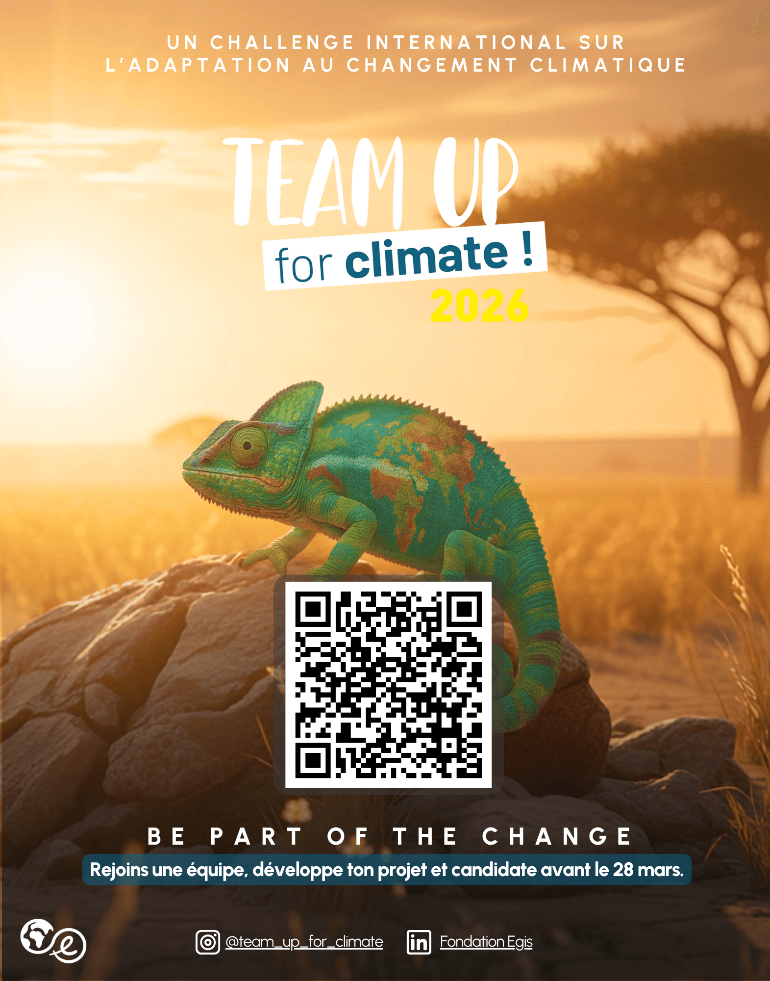 🌍 Relevez le défi climatique et passez à l’action ! Vous êtes étudiant(e) et vous souhaitez avoir un impact concret sur votre territoire tout en vivant une expérience internationale enrichissante ? Participez au challenge international Team Up For Climate, porté par la Fondation Egis, qui revient pour sa 5ᵉ édition ! Le principe : En équipe de 2 à 4 étudiants, vous serez invités à imaginer des solutions concrètes et innovantes pour répondre à un enjeu majeur de notre époque : l’adaptation au changement climatique, en lien direct avec les réalités de votre territoire.  Pourquoi participer ? - Travailler en équipe sur un projet à impact réel - Bénéficier d’un accompagnement dédié par des experts - Développer vos compétences (innovation, collaboration, engagement environnemental) - Donner de la visibilité à vos idées - Tenter de remporter des prix attractifs ! Votre idée peut faire la différence ! Que vous soyez passionné(e) par l’environnement, l’ingénierie, l’urbanisme, les sciences, le social ou l’innovation, ce challenge est fait pour vous. Osez, innovez, engagez-vous ! Formez votre équipe et rejoignez une aventure collective au service du climat ! 📌 Les inscriptions sont ouvertes – ne manquez pas cette opportunité de transformer vos idées en actions concrètes.