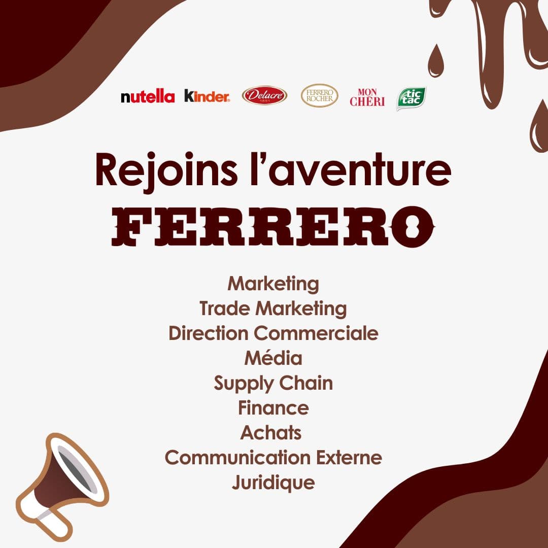 Tu recherches un stage de 6 mois à partir de janvier 2026 ? Tu souhaites découvrir l’univers de l'agroalimentaire, et plus particulièrement celui de Ferrero ? Nous attendons ta candidature ! Chez Ferrero, tu découvriras un univers dynamique, innovant et engagé, au cœur d’un groupe international reconnu pour ses marques iconiques : Nutella, TIC TAC, Rafaello, Kinder, Delacre, Délichoc et bien d'autres encore ! 💡 Pourquoi choisir l’agroalimentaire ? C’est un secteur en constante évolution, au croisement des enjeux économiques, environnementaux et sociétaux. Tu y développeras des compétences concrètes, utiles et valorisables dans de nombreux domaines. 🎯 Des challenges internes pour les stagiaires Chez Ferrero, les stagiaires ne sont pas là pour faire de la figuration ! Des projets concrets, des défis collaboratifs et des challenges inter-équipes rythment ton expérience pour booster ta créativité et ton esprit d’initiative. 🌿 Un environnement de travail inspirant Nos locaux incluent des espaces de détente, des zones de co-working et une ambiance conviviale propice à l’échange et à l’innovation. 📈 Des perspectives d’évolution Un stage chez Ferrero, c’est aussi une porte ouverte vers l’alternance ou un premier emploi. De nombreux talents ont commencé leur parcours ici ! Ferrero France - Offres d'Emploi et Informations sur les Carrières sur JobTeaser 🌍 Engagements RSE et DEI Ferrero s’engage activement en matière de responsabilité sociétale, de diversité, d’équité et d’inclusion. Tu évolueras dans un cadre respectueux, inclusif et tourné vers un avenir durable. 🎯 Envie de rejoindre l'aventure Ferrero ? Nos prochains stages débuteront en janvier ! Find your next job 𝑅𝑒𝑗𝑜𝑖𝑔𝑛𝑒𝑧 𝐹𝑒𝑟𝑟𝑒𝑟𝑜 𝑒𝑡 𝑑𝑒́𝑐𝑜𝑢𝑣𝑟𝑒𝑧 𝑙’𝑎𝑣𝑒𝑛𝑡𝑢𝑟𝑒...𝑚𝑎𝑖𝑠 𝑎𝑢𝑠𝑠𝑖 𝑙𝑎 𝑣𝑖𝑙𝑙𝑒 𝑑𝑒 𝑅𝑜𝑢𝑒𝑛 𝑒𝑡 𝑠𝑜𝑛 𝑐𝑎𝑑𝑟𝑒 𝑒𝑥𝑐𝑒𝑝𝑡𝑖𝑜𝑛𝑛𝑒𝑙 ! #TogetherWeGrow #FerreroFrance #WeAreFerrero #ChooseMyCompany #HappyTrainees #Inclusion #Diversité