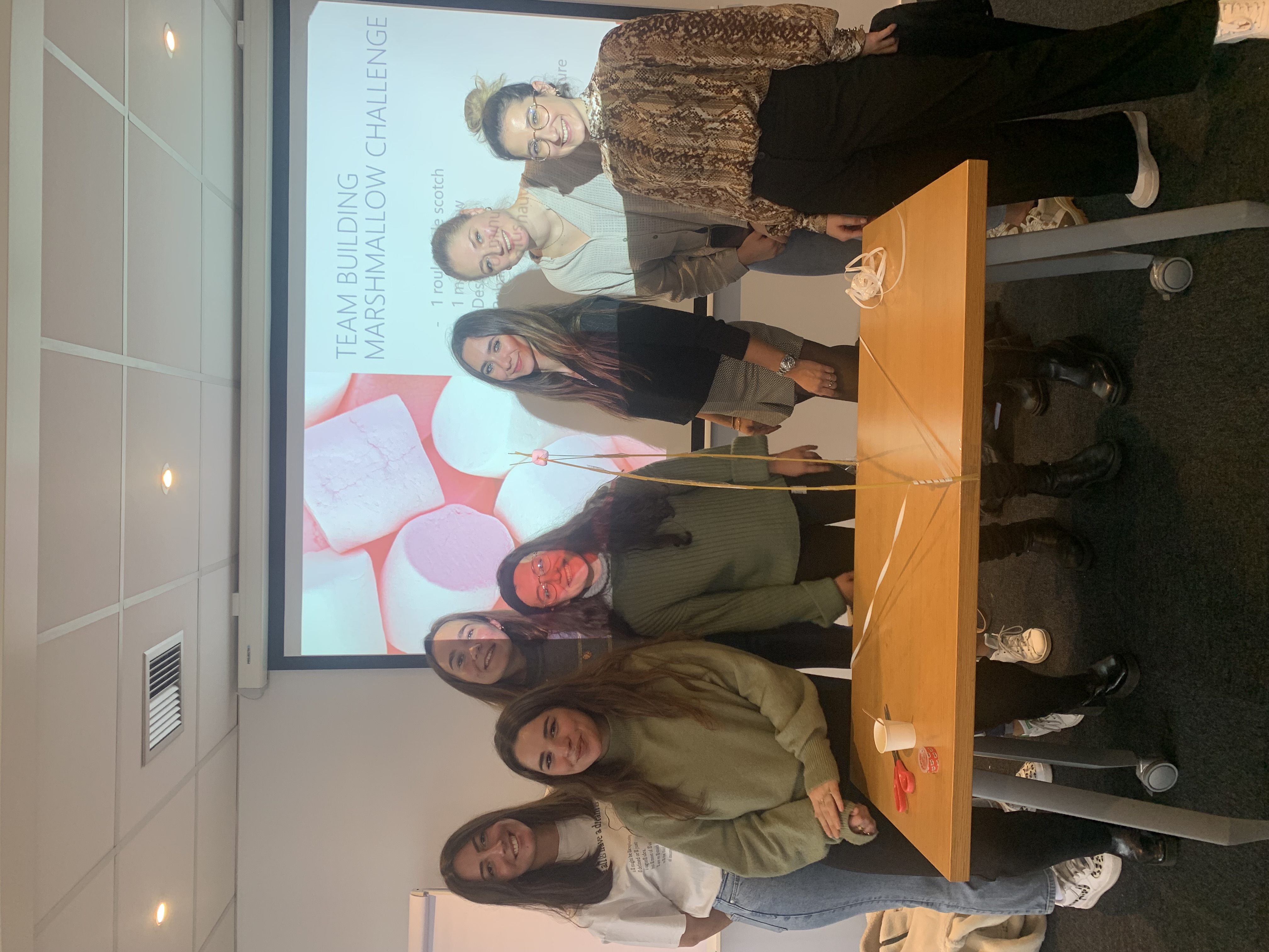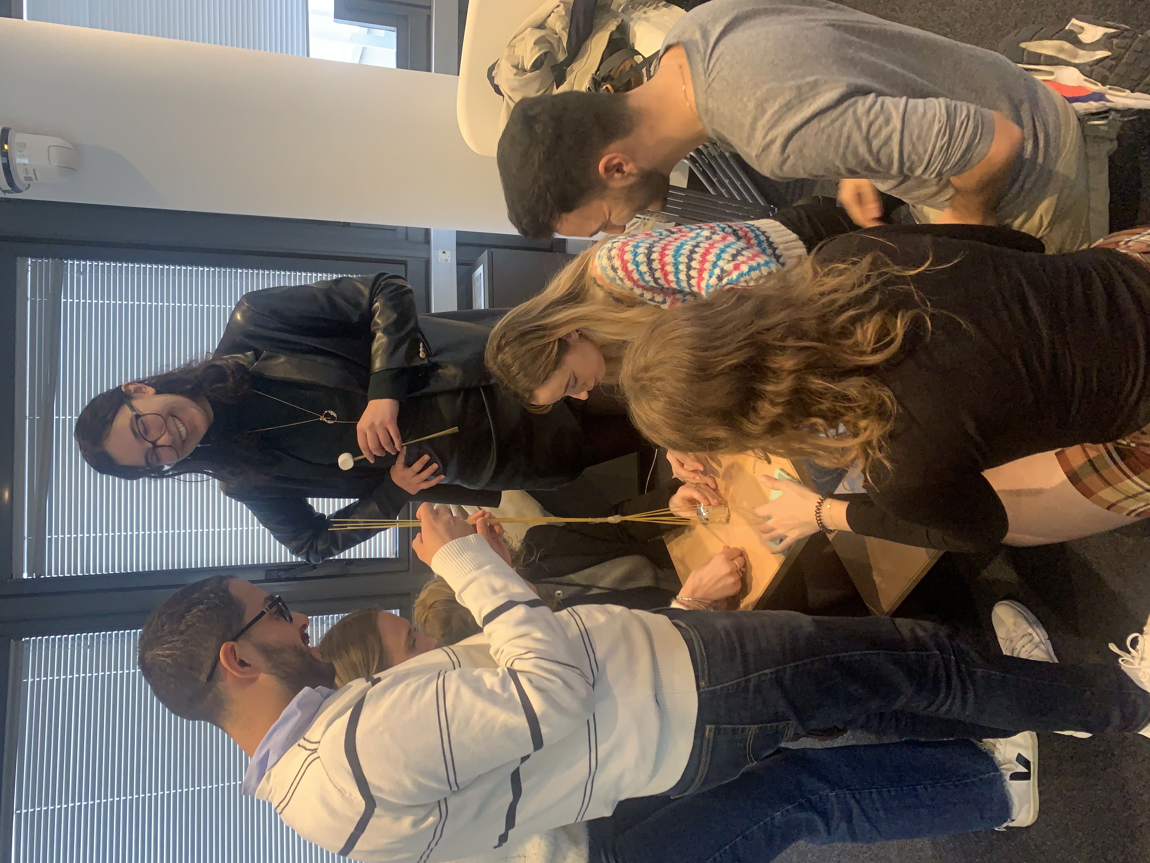 - Afin que tous puissent apprendre à mieux se connaitre, ils ont pu participer à un team building: le marshmallow challenge. Le concept ? A l'aide d'un rouleau de scotch, 1 marshmallow, 30 spaghettis et du ruban, ils doivent construire la plus haute structure. Attention ! Celle-ci doit tenir !