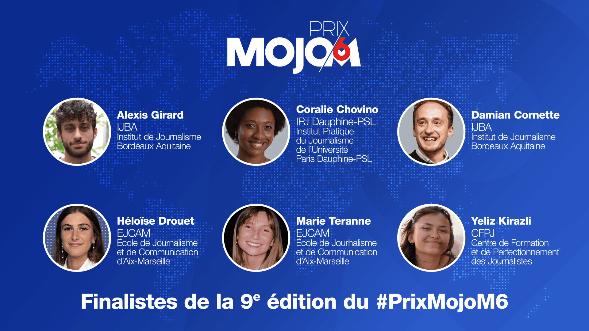 Les 6 finalistes Chaque école, parmi les écoles partenaires, a désigné deux candidats. Ces 2 candidats étaient invités, via leur responsable pédagogique, à envoyer un dossier comprenant : un reportage vidéo d’une durée de 1 minute et 30 secondes sur la thématique de leur choix et réalisé impérativement via un smartphone une « story format Instagram / Tik Tok / Facebook» (format 9/16e) de 4 slides pour présenter son reportage ou un montage vidéo de type avec les codes des réseaux sociaux avec des textes pour expliquer son reportage Après étude des dossiers, le jury a désigné les 6 finalistes : Alexis Girard – IJBA – Institut de Journalisme Bordeaux Aquitaine Coralie Chovino – Université Paris Dauphine- PSL Héloïse Drouet – École de Journalisme et de Communication d’Aix-Marseille Damian Cornette – IJBA – Institut de Journalisme Bordeaux Aquitaine Marie Teranne – École de Journalisme et de Communication d’Aix-Marseille Yeliz Kirazli – CFPJ