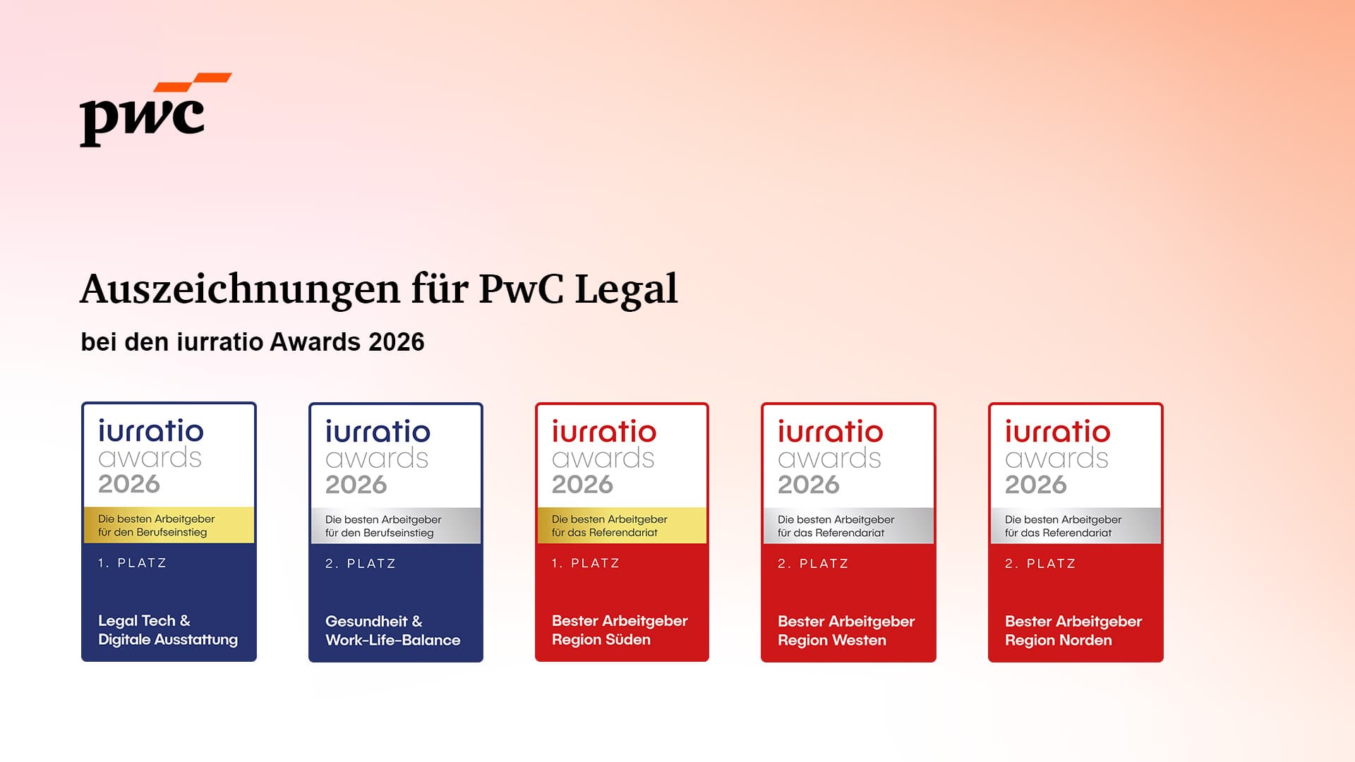 Wir sind stolz, mit PwC Legal bei den Iurratio Media GmbH Awards 2026 ausgezeichnet worden zu sein!