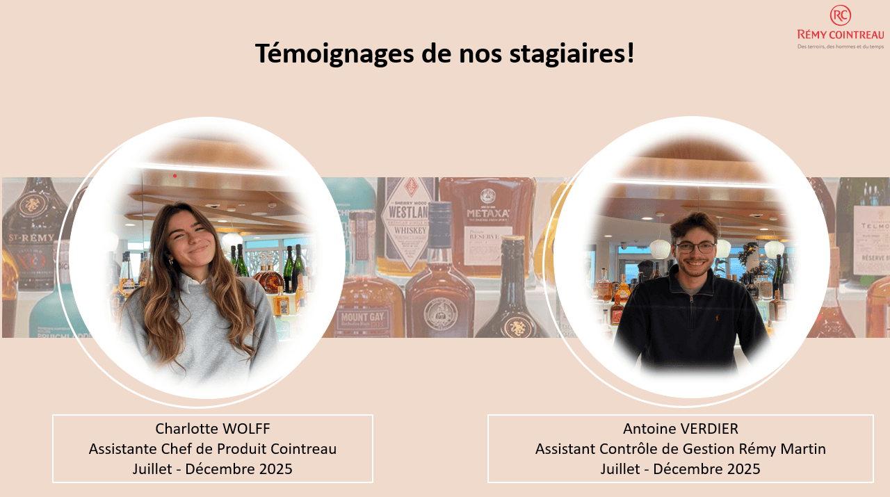 Voici ci-dessous les témoignages de Charlotte WOLF, Assistante Chef de Produit Cointreau, et d'Antoine VERDIER, Assistant Contrôle de Gestion Rémy Martin. Leurs récits vous permettront de découvrir l’expérience Rémy Cointreau de l’intérieur.