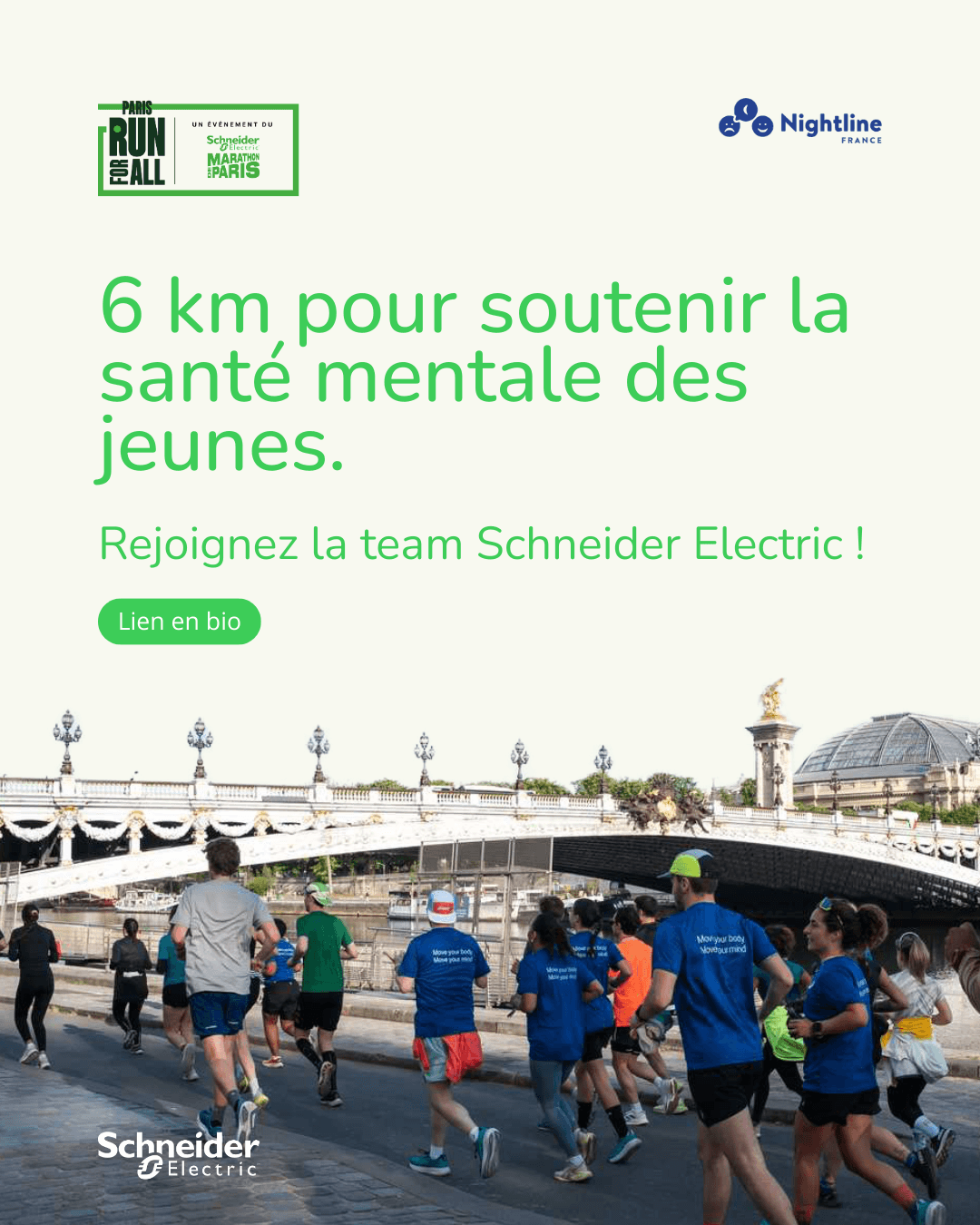Le Paris Run For All est de retour !  Cette course solidaire et inclusive, organisée dans le cadre du Schneider Electric Marathon de Paris, soutiendra cette année Nightline, association engagée pour la santé mentale des jeunes et des étudiants.   Au programme : 6 km au cœur de Paris, ouverts à toutes et tous, que vous couriez pour la première fois ou que vous veniez vous échauffer pour le marathon !   L'intégralité des  inscriptions sera reversée à Nightline pour financer ses actions de soutien et de sensibilisation autour de la santé mentale des jeunes, avec l’appui de professionnels.   Prêt à porter les couleurs de Schneider Electric le temps de cette course solidaire ? 💚  Inscrivez-vous via le lien ci-dessous :  https://careers.se.com/event-5262/talentcommunity/form?lang=en-US