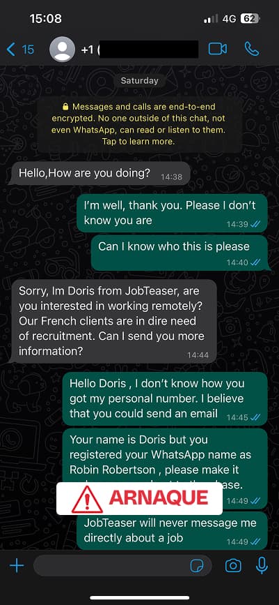 Nous rappelons que JobTeaser n'utilise pas WhatsApp comme outil de communication ou de recrutement.Ainsi, tout message WhatsApp prétendant provenir de JobTeaser ne peut être qu'une tentative d'arnaque.