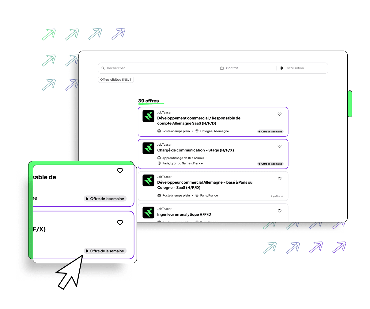 JobTeaser, c’est l’espace carrière de 800+ écoles et universités européennes, directement intégré aux Espaces Étudiants, qui vous donne un accès privilégié aux meilleurs talents et vous permet de recruter les pépites qui seront l’avenir de votre entreprise — directement depuis l’école.