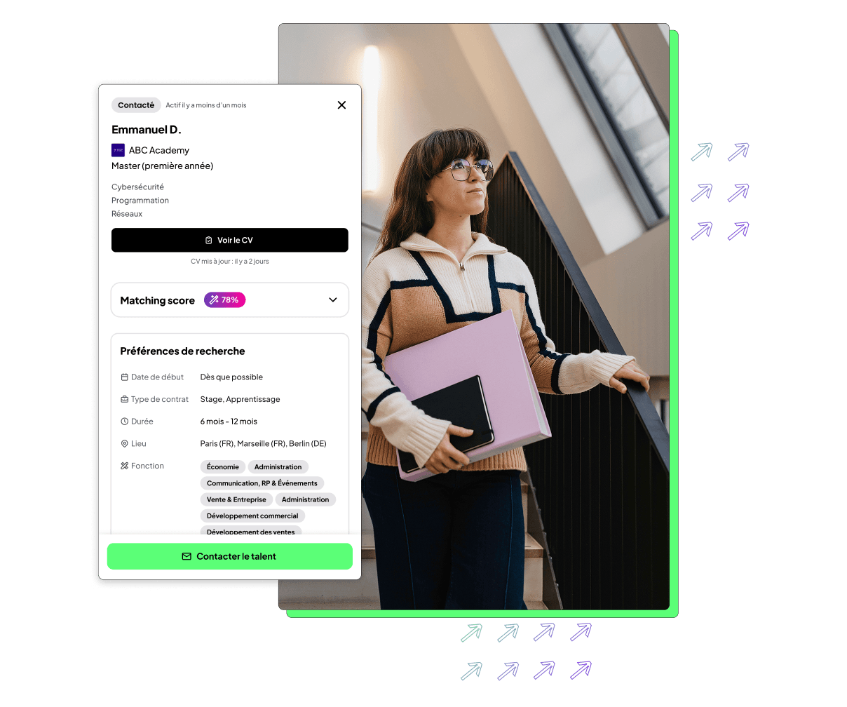 - Contactez vos candidats directement dans leur Espace Étudiant, là où ils sont 4x plus actifs que sur un jobboard classique.