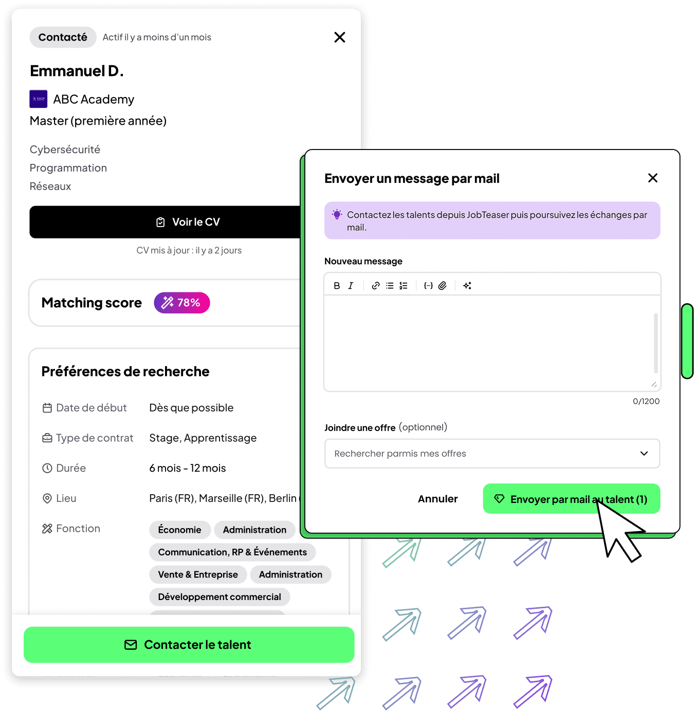 Contactez vos candidats pro-activement, directement dans leur Espace Étudiant, là où ils sont 4x fois plus actifs que sur un jobboard classique.