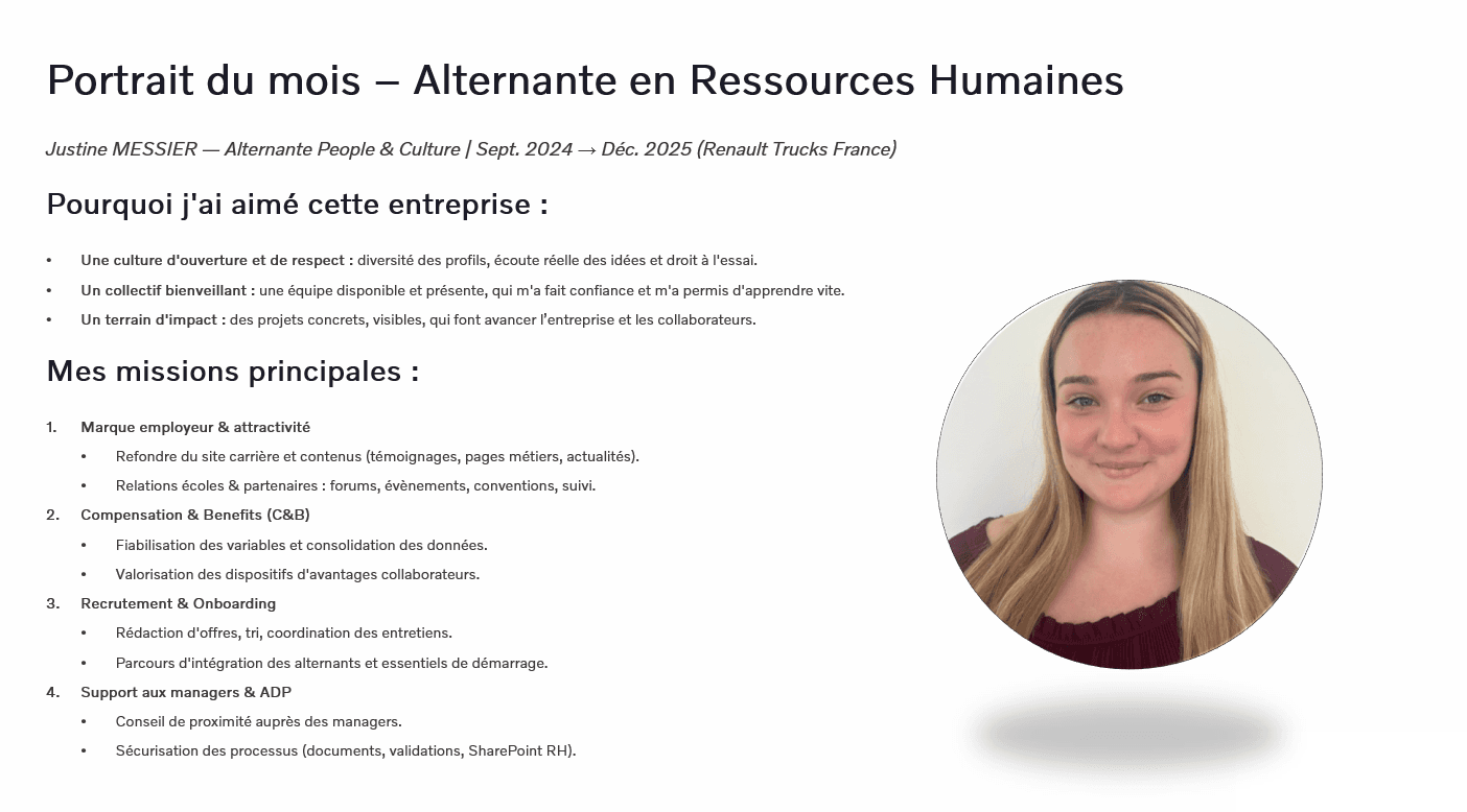 🎉 Bienvenue à nos nouveaux alternants ! Depuis quelques semaines, nous avons le plaisir d’accueillir nos nouveaux alternants et alternantes, prêts à débuter leur aventure sur notre site. Nos 21 nouvelles recrues viennent compléter des services variés, venant rejoindre le groupe d’apprentis qui compte désormais près de 50 collaborateurs. Ils vont pouvoir découvrir nos métiers, nos valeurs, s’en imprégner pour contribuer activement à nos projets afin de grandir ensemble. Nous avons à cœur de les accompagner tout au long de leur parcours pour faire de cette expérience une réussite humaine et professionnelle. 🚀 Bonne poursuite à toutes et tous ! #RenaultTrucks #Alternance #Intégration